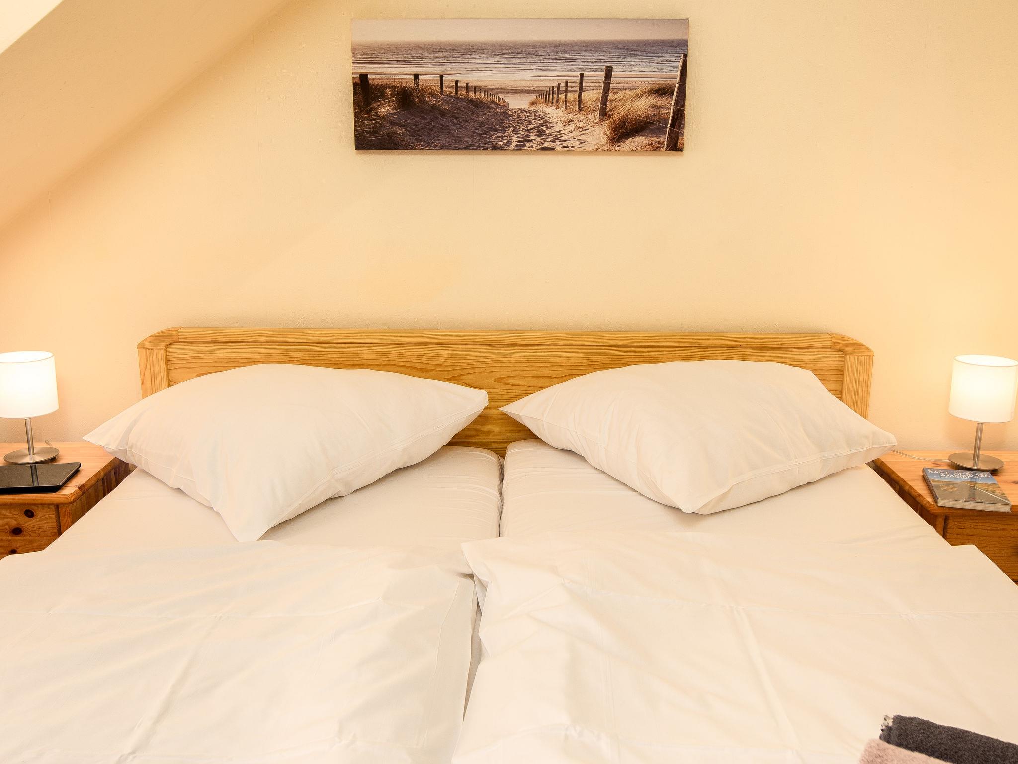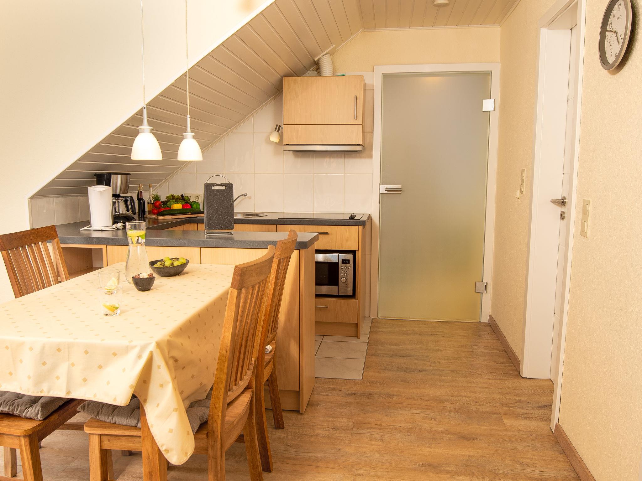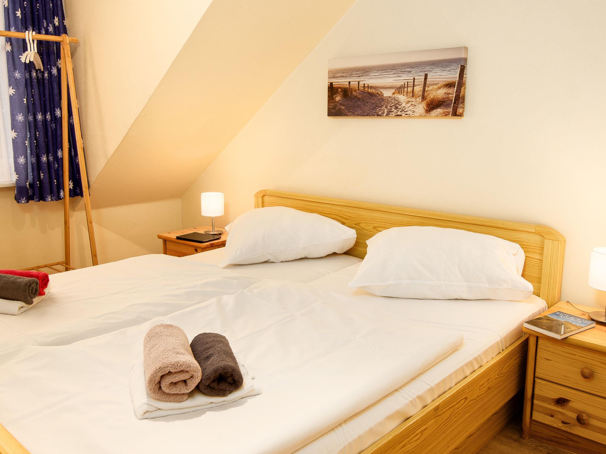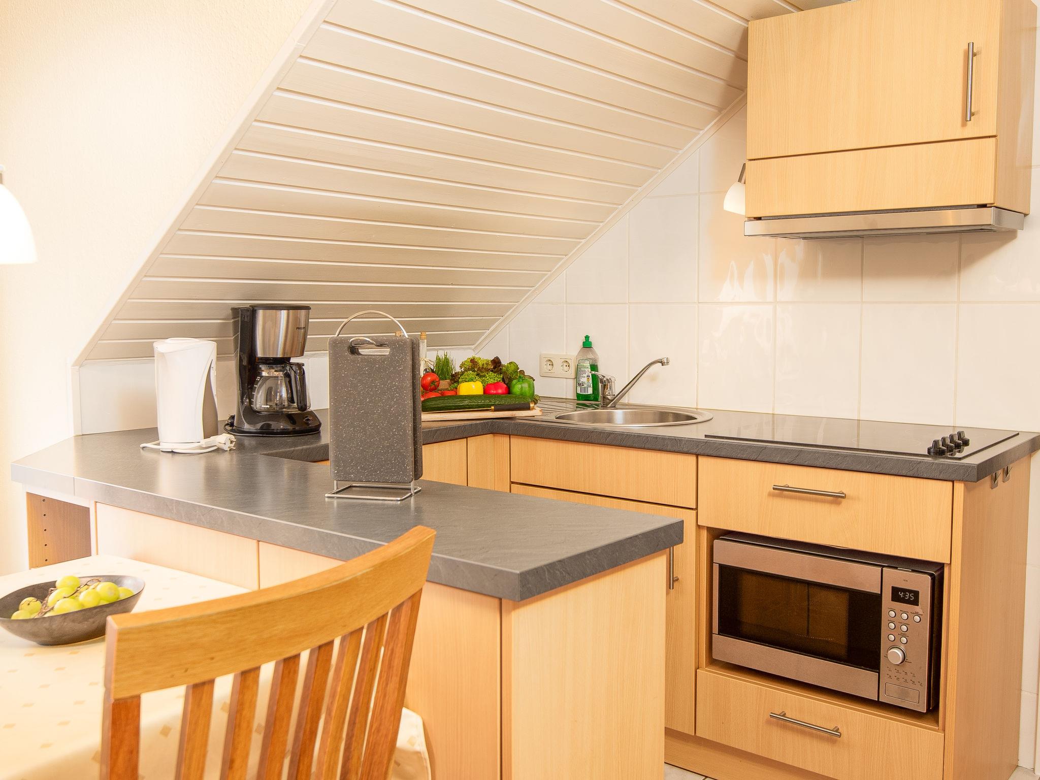 "Strandläufer", 3-room apartment 45 m2, on the upper floor. Partly with sloping ceilings, cosy furnishings: living/dining room 13 m2 with cable TV, hi-fi system and DVD. 1 room 9 m2 with 1 double bed (2 x 90 cm, length 200 cm). 1 room 6 m2 with 1 x 2 bunk beds (90 cm, length 200 cm). Kitchenette (4 ceramic glass hob hotplates, toaster, kettle, microwave, electric coffee machine). Shower/WC. Small balcony. Balcony furniture. Facilities: children's high chair (extra). Internet (WiFi, free). Please note: fridge without freezer, non-smokers only. Smoke alarm.