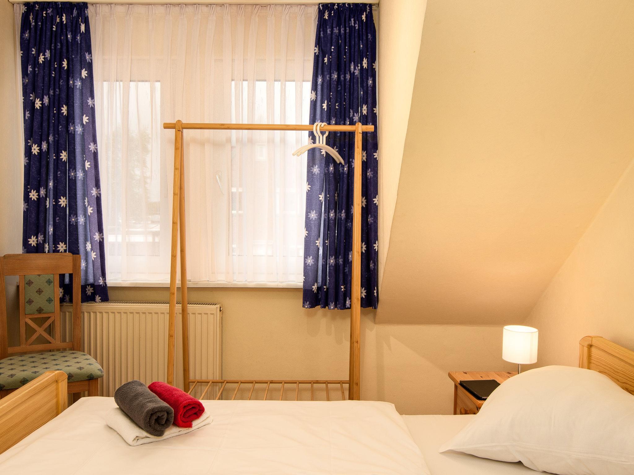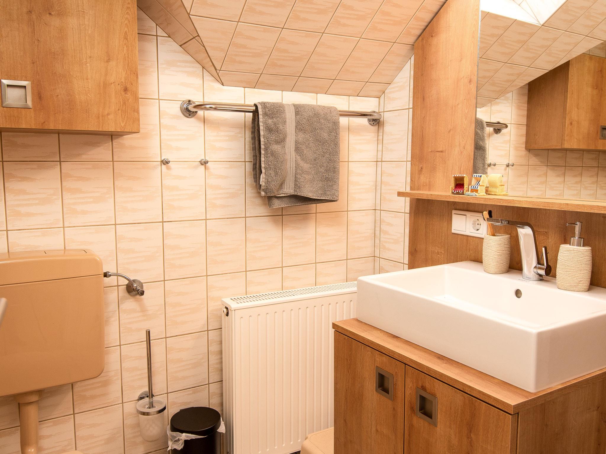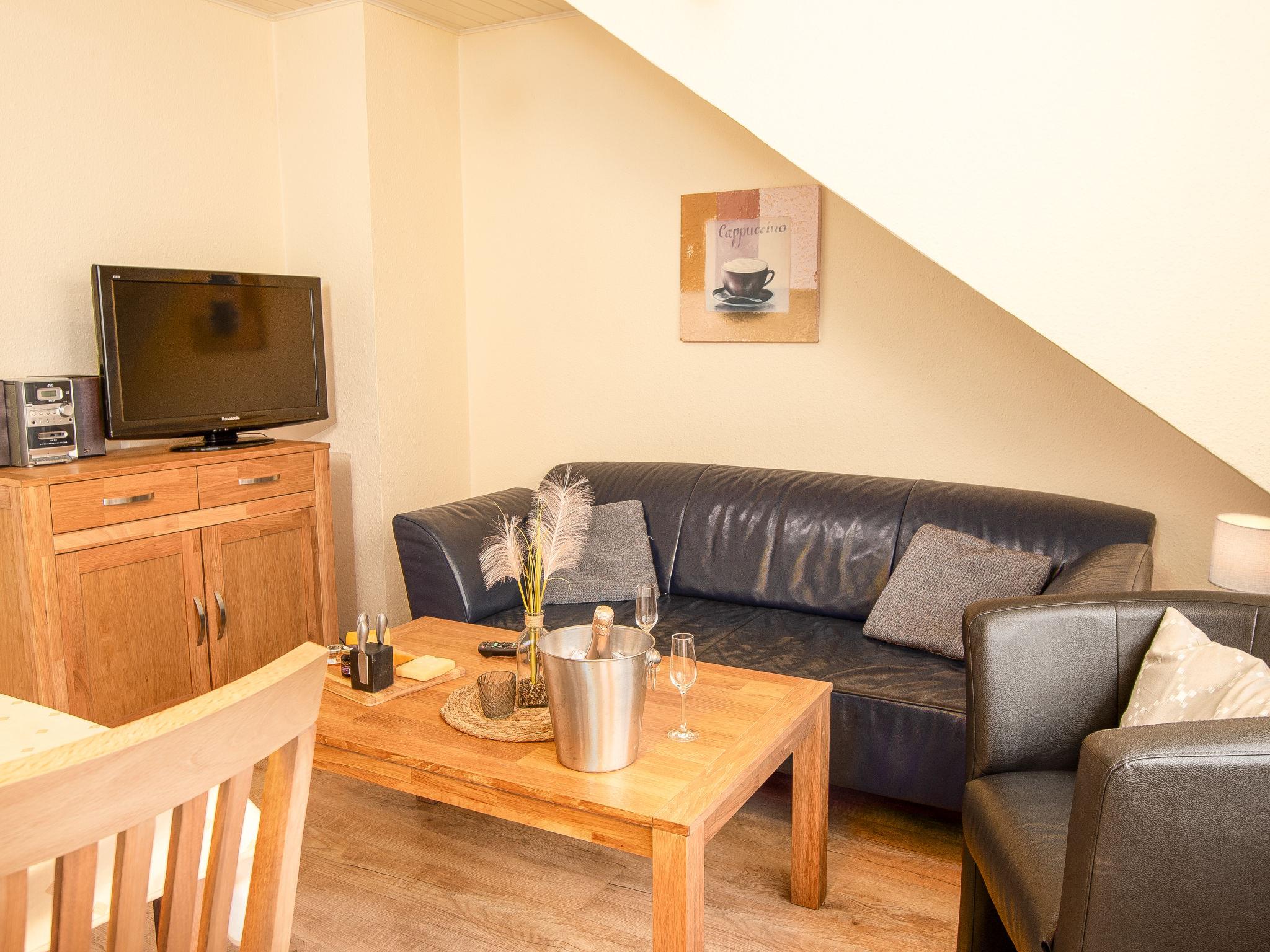 "Strandläufer", 3-room apartment 45 m2, on the upper floor. Partly with sloping ceilings, cosy furnishings: living/dining room 13 m2 with cable TV, hi-fi system and DVD. 1 room 9 m2 with 1 double bed (2 x 90 cm, length 200 cm). 1 room 6 m2 with 1 x 2 bunk beds (90 cm, length 200 cm). Kitchenette (4 ceramic glass hob hotplates, toaster, kettle, microwave, electric coffee machine). Shower/WC. Small balcony. Balcony furniture. Facilities: children's high chair (extra). Internet (WiFi, free). Please note: fridge without freezer, non-smokers only. Smoke alarm.