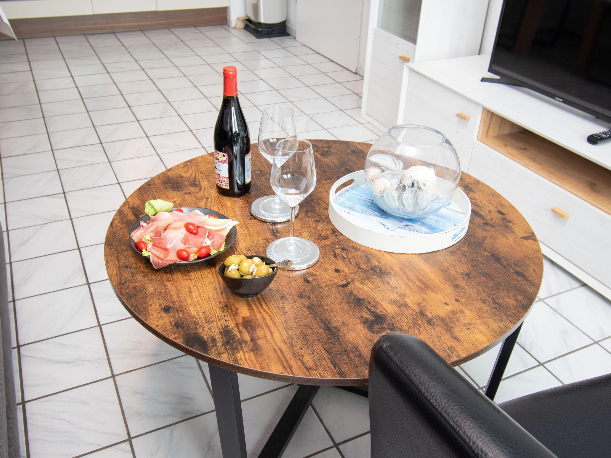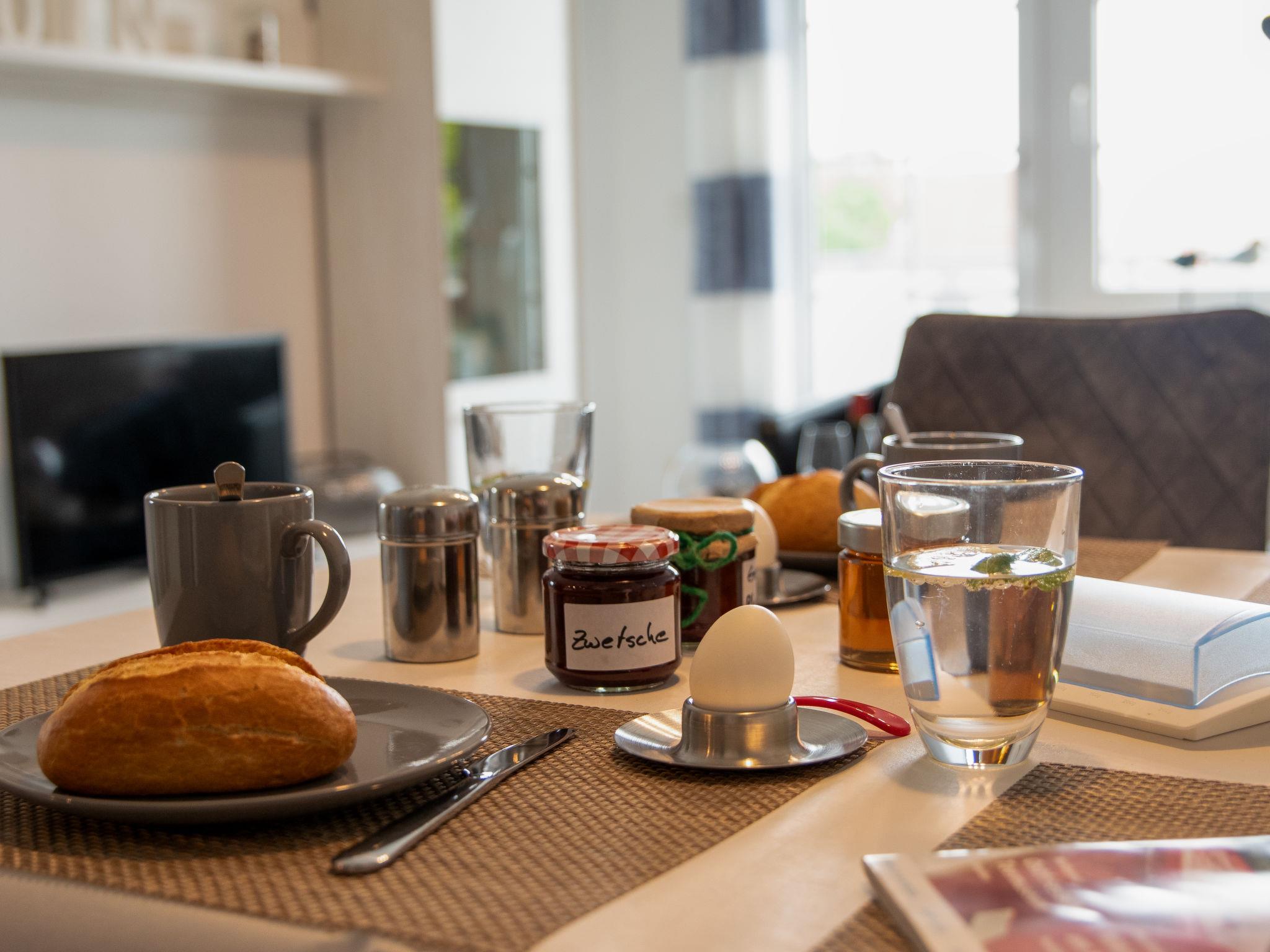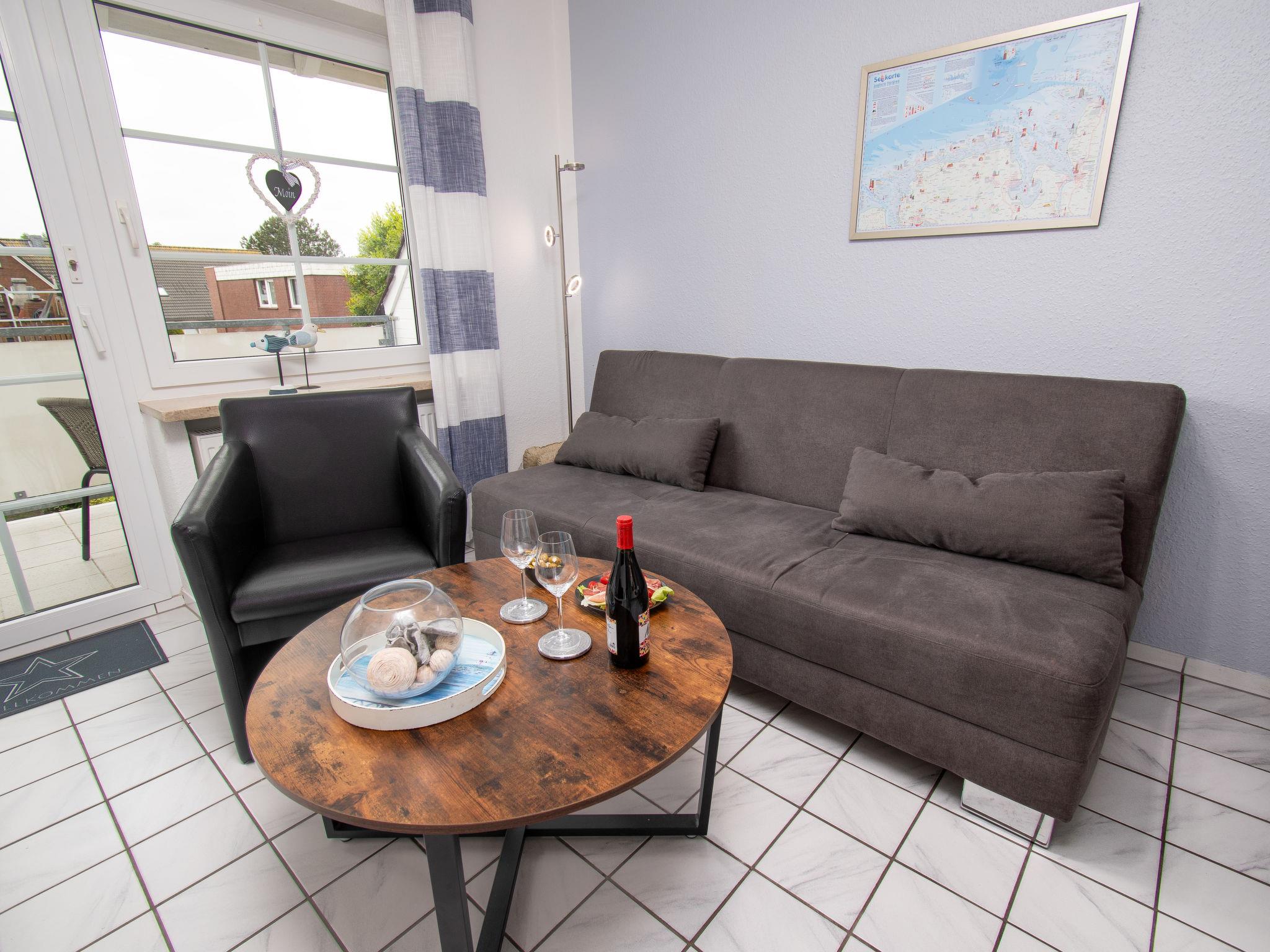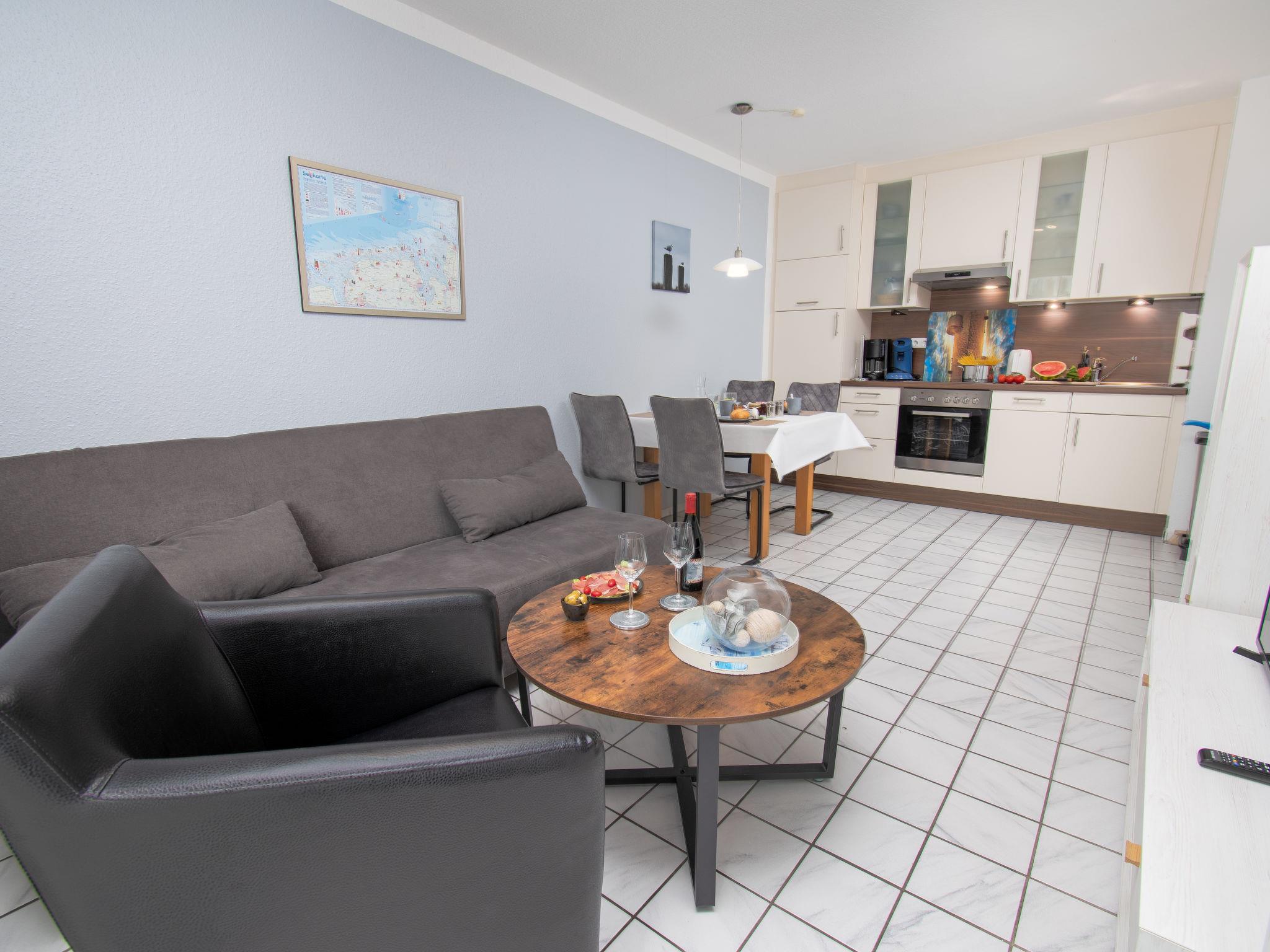"Krabbe", 3-room apartment 40 m2 on 1st floor. Partly with sloping ceilings: living/dining room with satellite TV (flat screen). 1 room with 1 double bed (2 x 90 cm, length 190 cm). 1 room with 2 beds (90 cm, length 200 cm). Kitchen (4 hot plates, oven, dishwasher, microwave, electric coffee machine, Capsules for coffee machine (Senseo) extra). Shower/WC. Balcony 8 m2. Balcony furniture. Facilities: children's high chair (extra). Internet (WiFi, free). Please note: fridge without freezer, non-smokers only. Maximum 1 pet/ dog allowed. Smoke alarm. The apartment is accessed via an outside staircase.