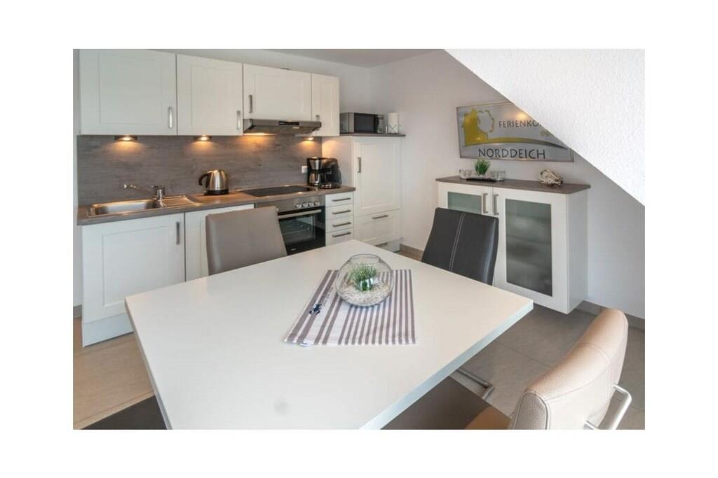 Landoase holiday apartment The name of the holiday apartment says it all - here you will really find an enchanting country oasis. Just 100 meters from the beach, you are very close to the North Sea and can enjoy yourself in your cozy holiday home. The Landoase holiday apartment is decorated in warm and light tones. Guests will also find everything they need for a pleasant stay. In the living room there is a comfortable couch with space for the whole family. The entertainment program is guaranteed thanks to the modern flat-screen satellite TV system, DVD and CD player. The modern fitted kitchen contains everything you need: the built-in stove with ceramic hob, the spacious refrigerator and the filter coffee machine are obligatory, Senseo pad machine, microwave and dishwasher are a convenient additional option. Of course, there is also a washing machine available in this property. A special highlight is the bathroom. It is not only very attractively designed, but also offers additional comfort with the level glass shower, underfloor heating and towel dryer. Four people can feel at home in the country oasis. There is a bedroom with a large double bed and a second room with two single beds. While the double room is on the same level as the rest of the living area, the second room in the attic has a very special flair due to the sloping ceilings. For a carefree start to your vacation, book our linen package. This consists of bed linen, towels, shower mats, tea towels and a service set (toilet paper, dishwasher tablets, garbage bags, dish brush, cleaning cloths and other little helpers for a carefree start to your vacation.