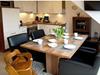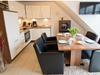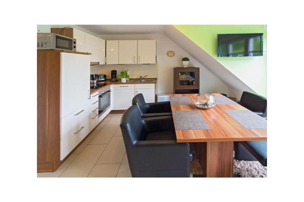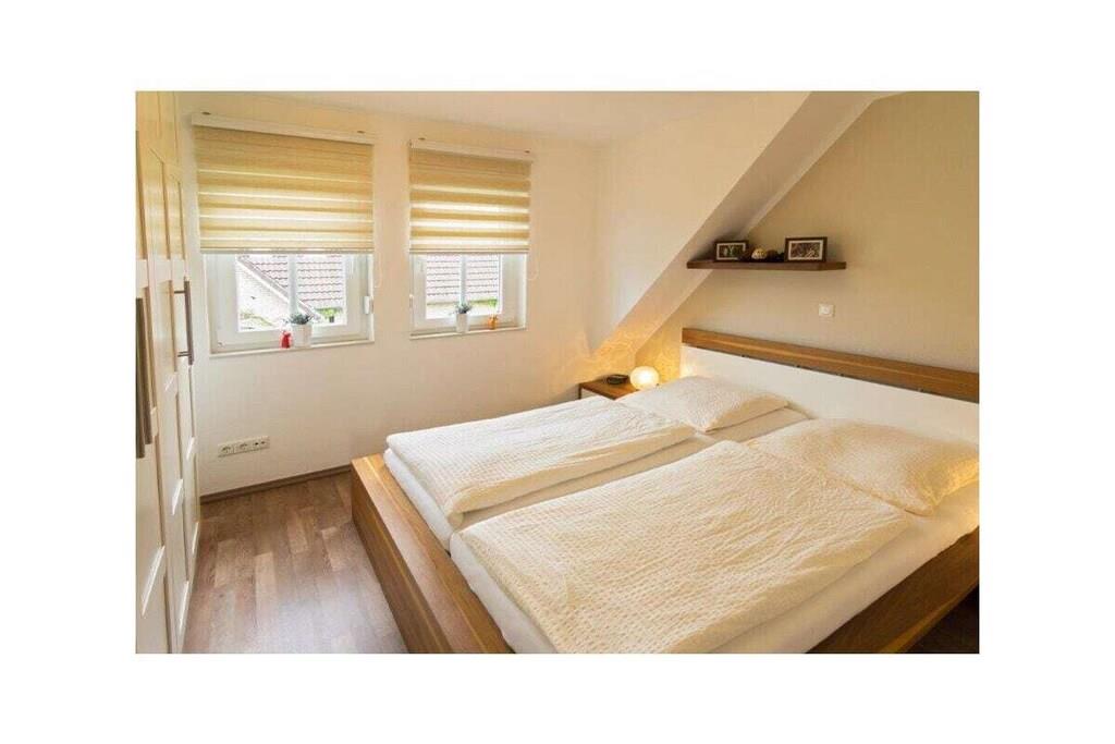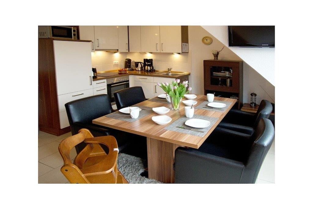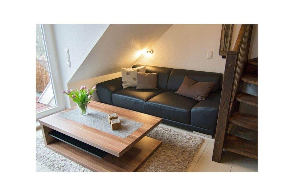 Holiday apartment Auszeit Treat yourself to a break from everyday life. This exceptional holiday apartment for four people invites you to do just that. It is probably the many small luxurious details that make the holiday apartment Auszeit a very special property. This includes the comfortable leather couch in the living and dining area, where you can relax and enjoy the evening hours. A flat-screen TV including satellite reception and DVD player as well as a music system with USB connection provide the desired entertainment. Or come together for a cozy gathering at the dining table. In the kitchen you have everything you need, including modern electrical appliances, cooking and dining utensils. Of course, a dishwasher is also part of the comfort. Two bedrooms offer space for four people. The first, which is on the same level as the living area, has a large double bed. The second bedroom with two single beds is located in the attic. The sloping ceilings make it particularly cozy. There is also a flat-screen TV here, so that the older children can also retreat. The entire property has underfloor heating. Even a harsh climate is no problem here. Enjoy the hours of sunshine in your own beach chair on the balcony of the holiday apartment. Here you are protected from the wind and can enjoy the unique climate to the full. For a carefree start to your holiday, book our linen package. This consists of bed linen, towels, shower mats, tea towels and a service set (toilet paper, dishwasher tablets, garbage bags, dish brush, cleaning cloths and other little helpers for a carefree start to your holiday.