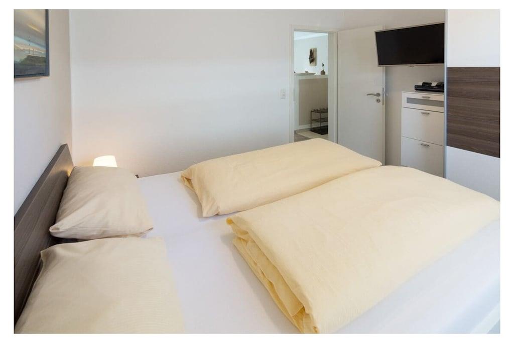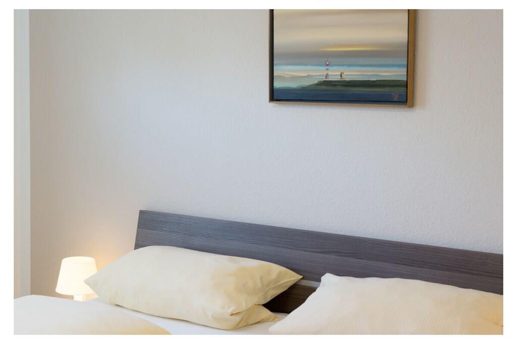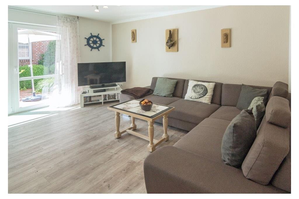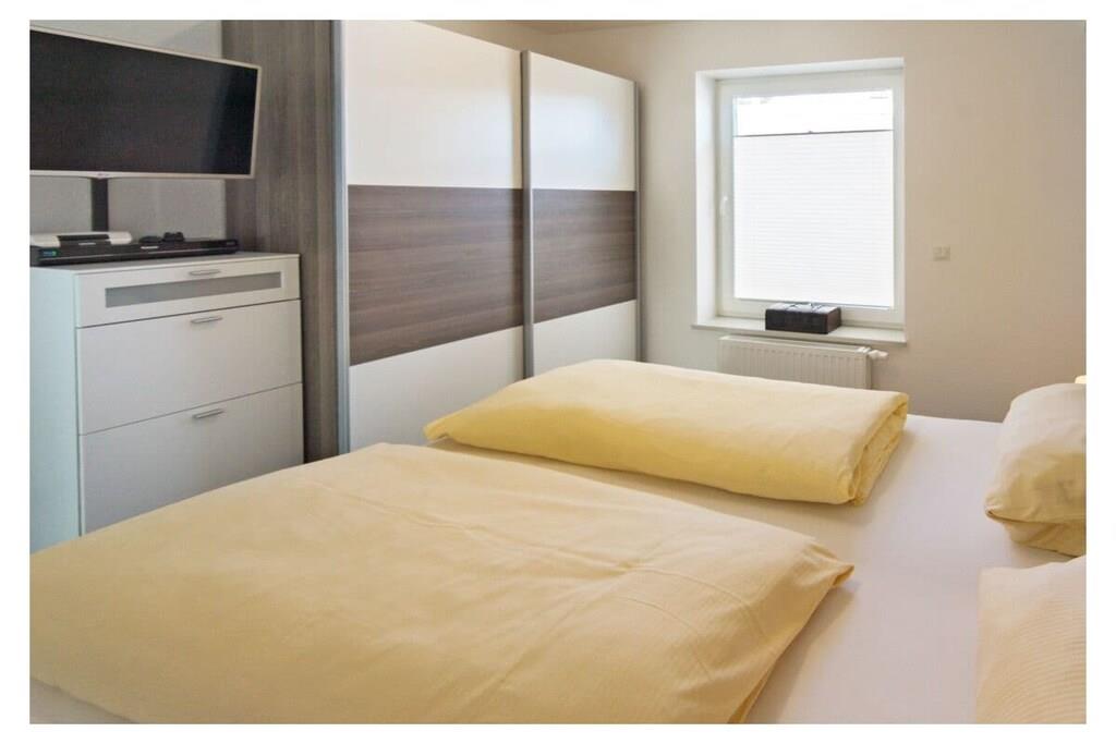 Apartment facilities Living space 48 m², accommodation for 2+1 people, private parking space, terrace with garden furniture Kitchen The fitted kitchen is presented in white piano lacquer and the furniture (dining area and sideboard, small table) is in solid oak style. In the comfortable kitchen you will find: dishwasher, refrigerator, freezer, oven, microwave, coffee pad and a filter coffee machine, ceramic hob, kitchenette, complete cooking utensils and toaster, even the very little ones can find space here thanks to the high chair that can be delivered. As a special highlight, you will find a "stone raclette" in this holiday apartment for culinary enjoyment in the evening. Living area The pull-out corner sofa with sleeping function invites you to linger, comfortable seating for 4 people, flat screen TV (satellite TV with free reception of HD + programs) with a size of 48 inches and a BlueRay player including DVDs and BlueRays make an evening in front of the TV an experience. A music system with an iPod docking station and various books are also available here. Dining area Dining area, seating for 4 people, high chair that can be delivered Bathroom The beautiful bathroom offers you: toilet, shower, hair dryer, a modern washbasin combination, plenty of storage space as well as underfloor heating and a towel dryer. Sleeping areas Sofa bed in the living room, 1 bedroom with sleeping space for 2 people in a double bed, here too there is a new LED TV, this is supplemented by a BluRay player and the radio alarm clock is obligatory. Storage room Here you will find the washing machine and all other utensils such as a vacuum cleaner, dustpan & broom, clothes rack, ironing board, iron, books and toys for the children. Outdoor area There is a private parking space directly next to the house, the terrace is equipped with garden furniture including 4 comfortable garden chairs and a table. Behind the house