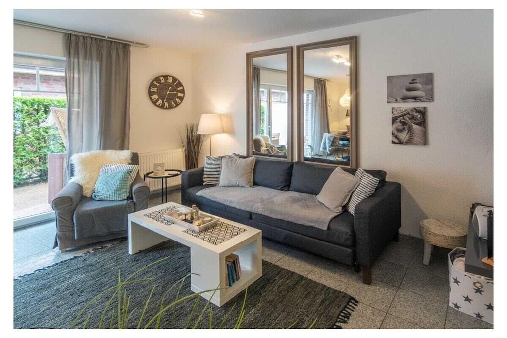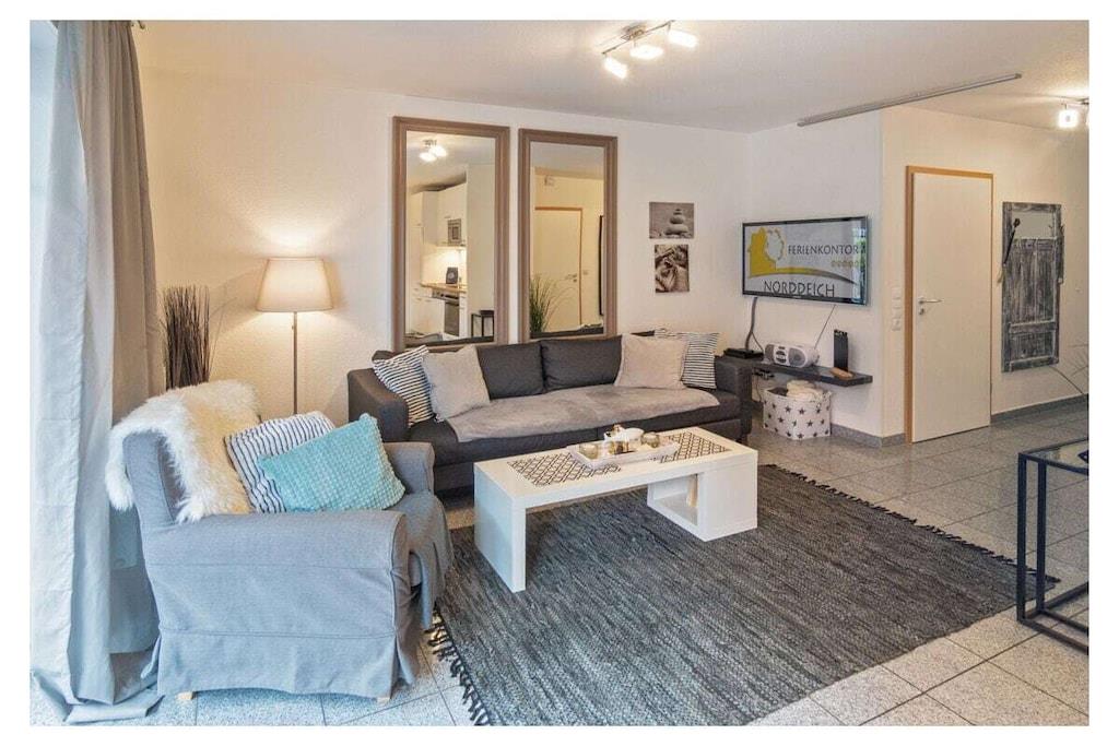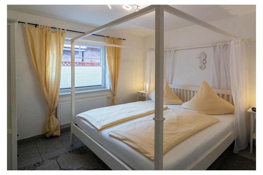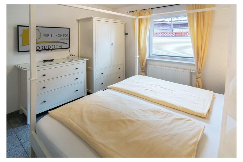 Holiday apartment Dünenrose Anyone who assumes that a holiday apartment is sober and impersonal will quickly be proven wrong by this beautiful property. The holiday apartment Dünenrose lives up to its name. The apartment is located right behind the dune on the extensive beach of Norddeich and leaves nothing to be desired for two to three people with a maximum of one child (baby or toddler). All rooms are cozy and furnished with great attention to detail. In addition, the Dünenrose has all the technical comforts. There are modern flat screen TVs in both the living room and the bedroom with the beautiful four-poster bed. Of course, you also have a satellite system and DVD player as well as a music system at your disposal. The kitchen also has everything your heart desires. In addition to the usual cooking utensils, you will find all electrical appliances here, including a microwave and dishwasher. In the bathroom, the underfloor heating ensures homely comfort even on cold days. Enjoy the immediate proximity to the beach. You can end the evening on the terrace. For a carefree start to your vacation, book our linen package. This consists of bed linen, towels, shower mats, tea towels and a service set (toilet paper, dishwasher tablets, garbage bags, dishwashing brush, cleaning cloths and other little helpers for a carefree start to your vacation.