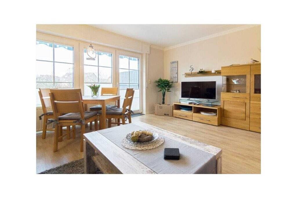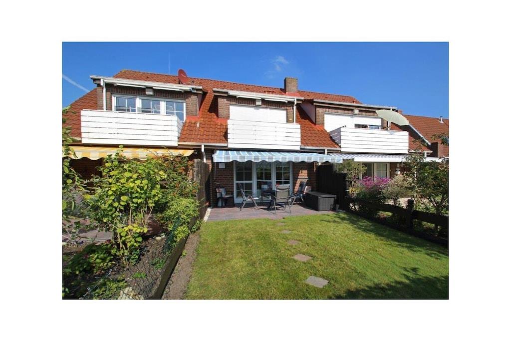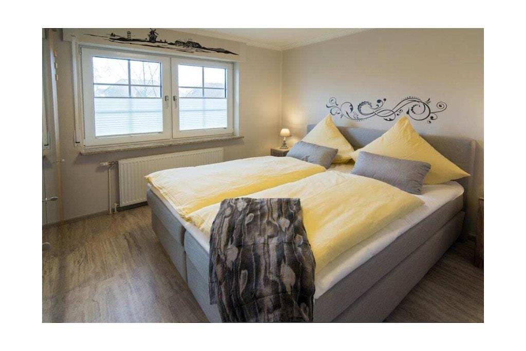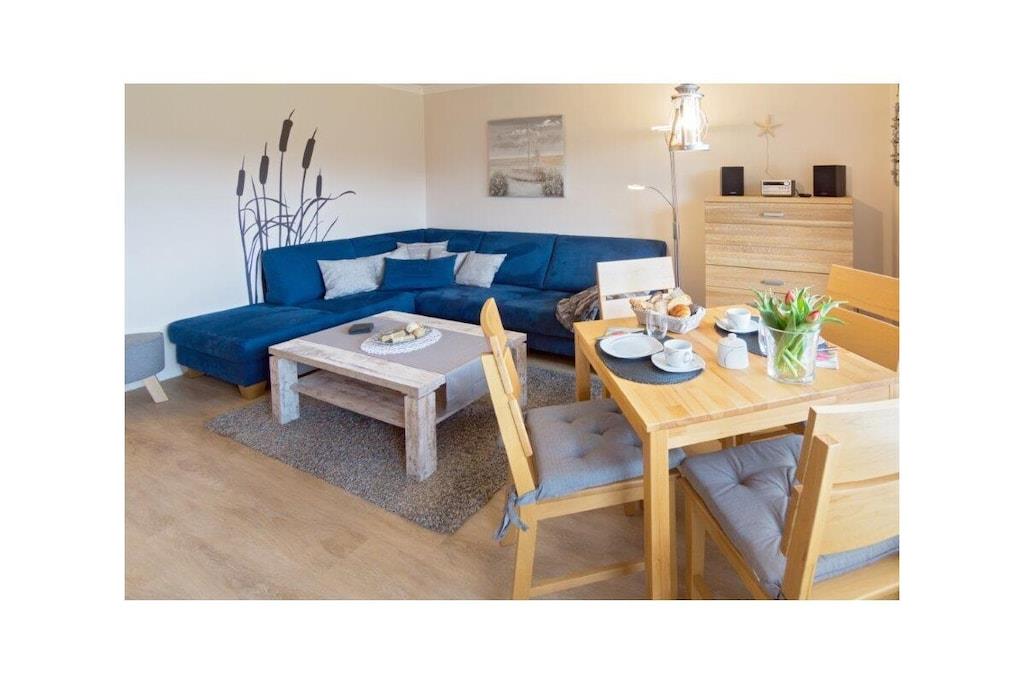 Holiday apartment Jolle D11 Jolle D11 is your little holiday paradise in Norddeich. Two people will find everything they need for a pleasant stay in the comfortable and comfortably furnished apartment. The cozy seating area in the spacious living area invites you to linger. A modern flat screen TV including satellite TV, DVD player and the music system provide the desired entertainment. Bright, warm colors and many lovingly selected maritime accessories dominate this living area, so that you feel completely at home from the very first moment. The bathroom was completely renovated at the beginning of 2022 and now shines in a new light. The chic fitted kitchen is perfectly equipped so that no culinary wishes are left unfulfilled for cozy evenings for two. In addition to the usual cooking utensils and kitchen appliances, you also have a microwave and of course a dishwasher at your disposal. A comfortable box spring bed awaits you in the bedroom, so you don't have to worry about your restful sleep. What is particularly nice about this property is the fully equipped terrace with a small garden, which completes your little kingdom. Spend carefree and relaxing hours here. For a carefree start to your vacation, book our linen package. This consists of bed linen, towels, shower mats, tea towels and a service set (toilet paper, dishwasher tablets, garbage bags, dish brush, cleaning cloth and other small helpers) for a carefree start to your vacation.