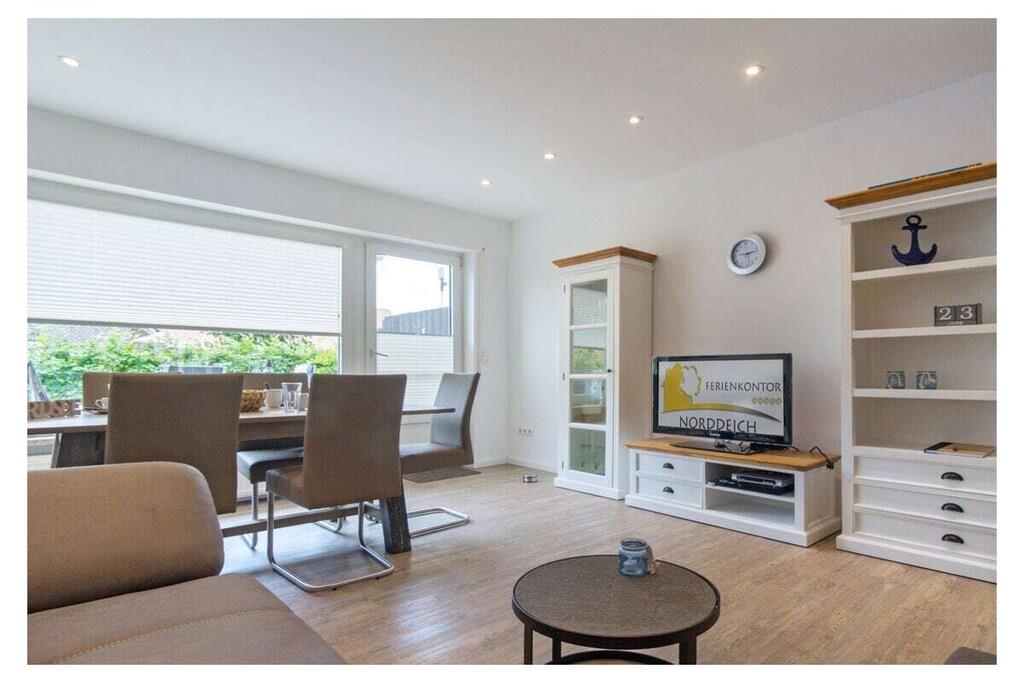 Holiday home Norddeich This holiday home leaves nothing to be desired. Here the whole family can spend a wonderful holiday in the heart of Norddeich without having to forego any comfort. The 70sqm and very spacious holiday apartment is in a prime location. In just a few minutes' walk you can easily reach the highlights of this beautiful region, regardless of whether you want to spend a day on the beach, visit the seal breeding station or swim to your heart's content in the Ocean Wave. Shops, bakeries and restaurants are also within walking distance. Your holiday home has been furnished in a modern style and with great attention to detail. The heart of the house is the spacious living, dining and cooking area. Here, warm, friendly colors ensure a real feel-good atmosphere. From the cozy living area you can watch your favorite program in the evening on the modern 42-inch flat screen TV with HDMI satellite receiver and Blue-Ray player. A CD player with radio is also provided for unlimited music enjoyment. A WiFi connection rounds off the exclusive offer. The apartment has two comfortably furnished bedrooms. Both have also been equipped with modern flat-screen TVs. There are also two bathrooms at your disposal, one of which has been completely redesigned and equipped with a comfortable walk-in glass shower. A special highlight is the spacious terrace, where you can end the perfect holiday day in the comfortable lounge furniture. For a carefree start to your holiday, book our linen package. This consists of bed linen, towels, shower mats, tea towels and a service set (toilet paper, dishwasher tablets, garbage bags, dish brush, cleaning cloths and other small helpers) for a carefree start to your holiday.