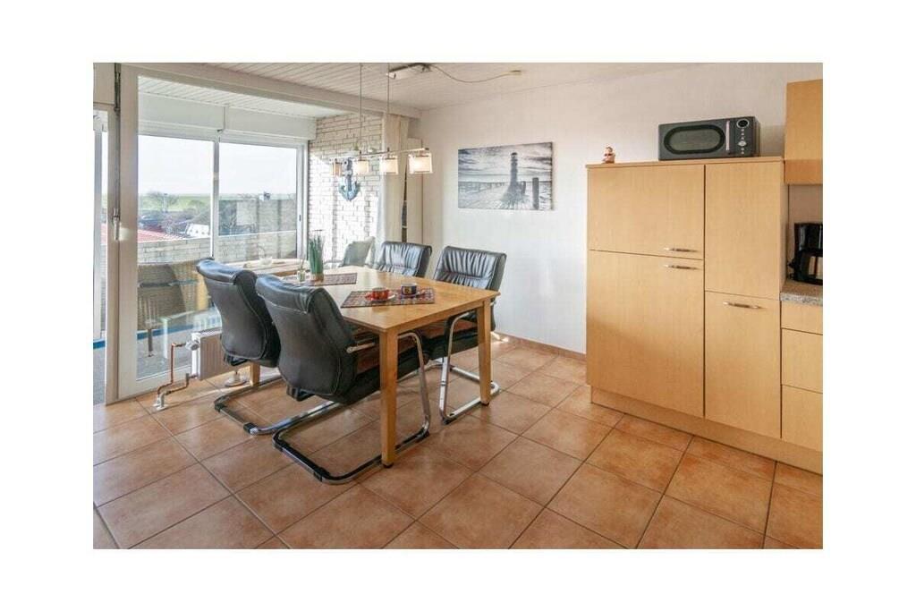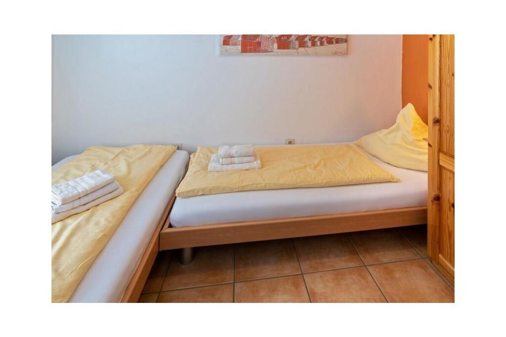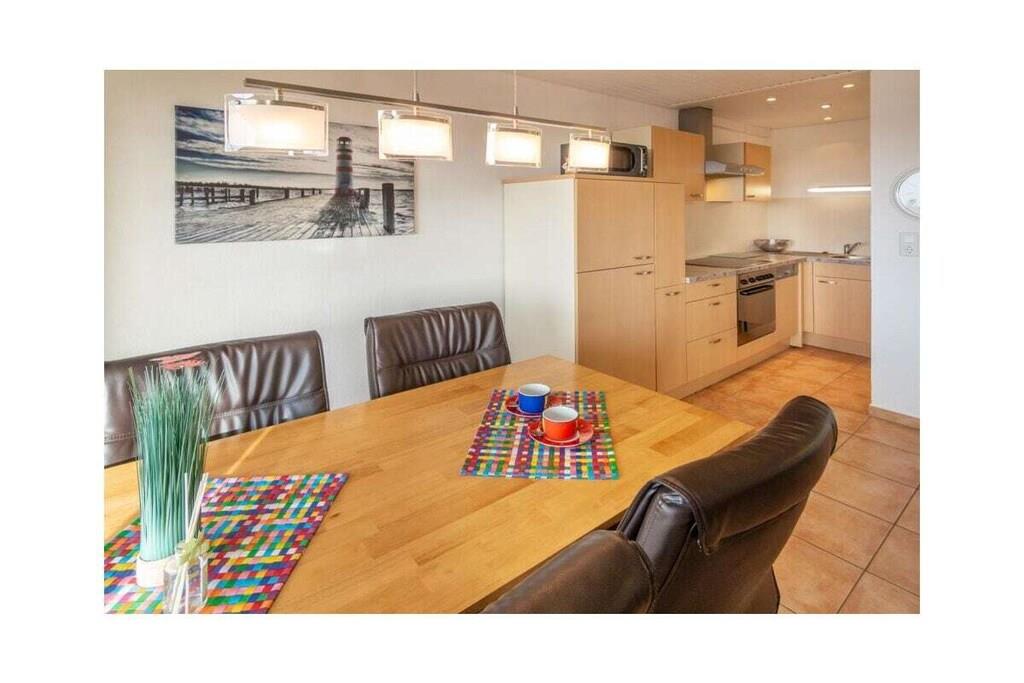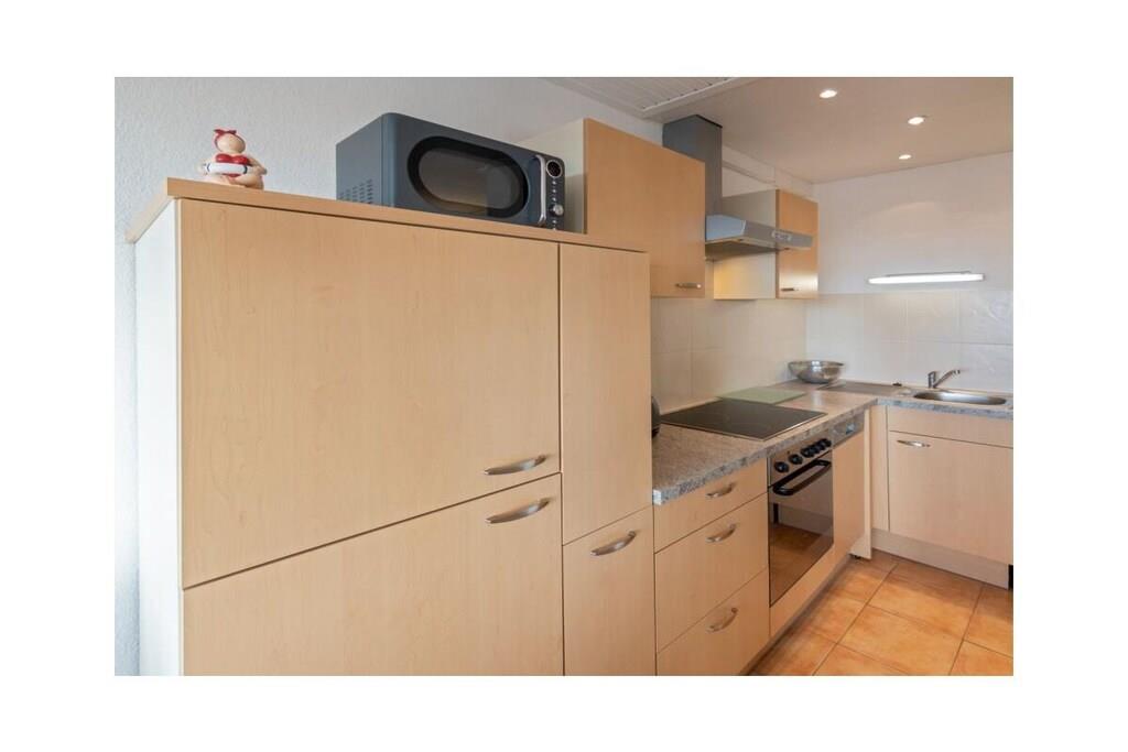Holiday apartment Dörperweg 3, Norddeich, sea view Apartment 17, 3rd floorThis beautiful holiday apartment is in a wonderfully central location in Norddeich, just a few steps behind the dike. Due to its location on the top floor of a well-kept apartment building, guests can enjoy a side view of the sea. The pretty little apartment has been furnished with great attention to detail and a sense of functionality. The heart of the apartment is the combined living and dining area, which invites you to spend many pleasant hours. The living area has been equipped with a comfortable corner sofa (with sleeping function) and a TV corner, so that entertainment is guaranteed even on rainy days. The kitchen is practically furnished and has everything you need for cooking together. In addition to the dishes and cutlery, this includes amenities such as a stove with oven, a coffee machine, a refrigerator, a microwave, a dishwasher integrated into the kitchenette, a toaster and an egg cooker. The cozy dining area offers space for four people. The highlight of the sea view apartment is the balcony adjacent to the living room. This has been converted into a glazed winter garden. This means you can enjoy the wonderful North Sea panorama even in winter. When the weather is nice, the winter garden can be opened so that guests can fully enjoy the pleasant climate. Thanks to the south-west orientation, you can enjoy the wonderful sea view from the balcony/winter garden. A comfortable seating area for four people ensures comfort. The guest apartment has a small, cozy bedroom, which is equipped with two 90 x 200 cm single beds. The wardrobe offers enough space for the wardrobe. In addition, jackets and coats can also be stored in a second closet in the hallway. The beautifully designed small bathroom has a shower, a toilet and a washbasin combination with a large