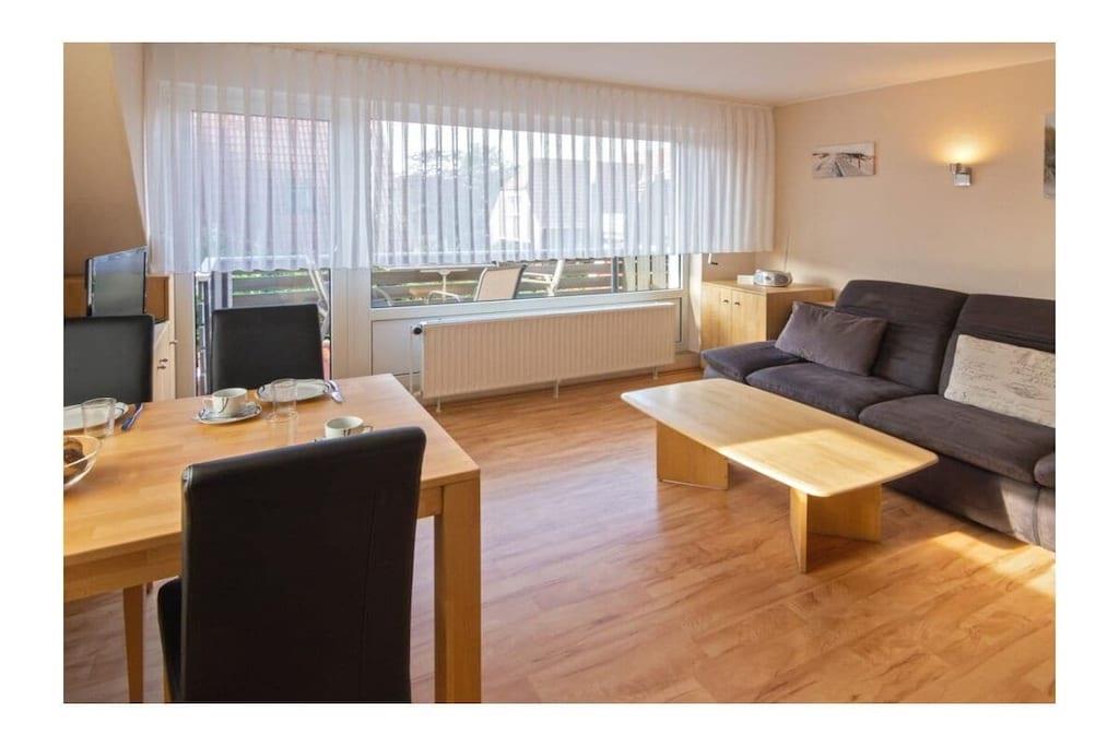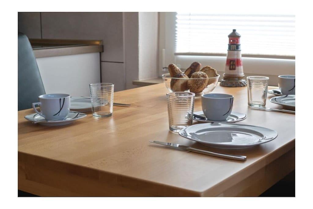 Holiday apartment Lima, Am Koper Sand 16, Norddeich Norddeich welcomes you to a perfect North Sea holiday where you will want for nothing. Located directly on the wonderful, eight-hectare sandy beach, the tranquil district of Norden offers a diverse infrastructure. Stroll through the wide streets of the popular coastal resort, try out the gastronomic offerings and browse through the pretty little shops. In addition, there is a varied leisure program in and around Norddeich that leaves nothing to be desired and guarantees fun and relaxation for the whole family. The holiday apartment Our holiday apartment Lima is on the first floor of a detached house with a total of four residential units. The property is located in a quiet side street, so nothing will disturb your well-deserved rest. Nevertheless, it is only a few steps to the lively center of Norddeich with its diverse offerings. Just as quickly, in just a few minutes, you can be on the wonderful kilometer-long Norddeich beach. Your holiday apartment is cozy and comfortable and has space for three people. The heart of the apartment beats in the lovingly designed and light-flooded living and dining room with the small kitchenette and the adjoining dining area. Here you can relax in the cozy 2-seater sofa corner, read a book or enjoy evenings watching TV together. The kitchen is functionally furnished with everything you need for cooking together. The equipment includes a stove with four hotplates, a refrigerator, a coffee machine, a toaster, a mixer and of course a set of dishes, glasses and mugs. Take your meals at the dining table with the three matching chairs, which is placed directly next to the kitchen unit. If it is too bright for you in the light-flooded apartment, the windows can be darkened for the most part with blinds or pleated blinds. From the bright,