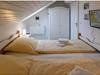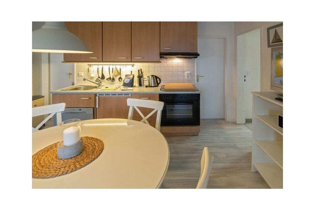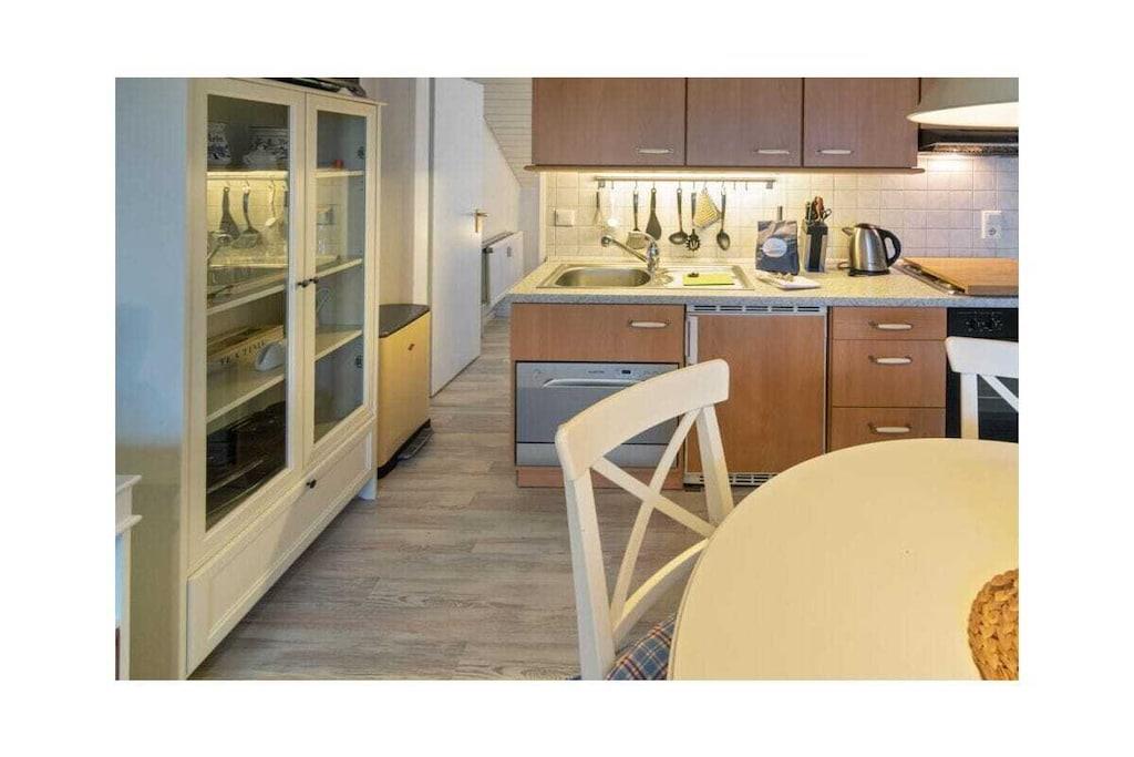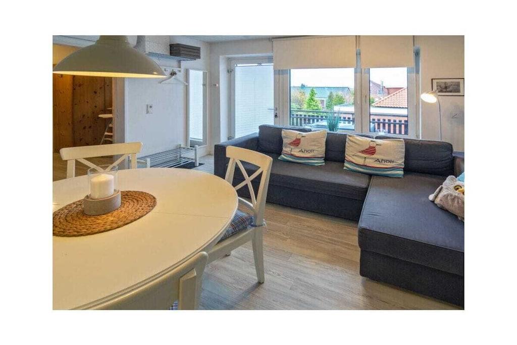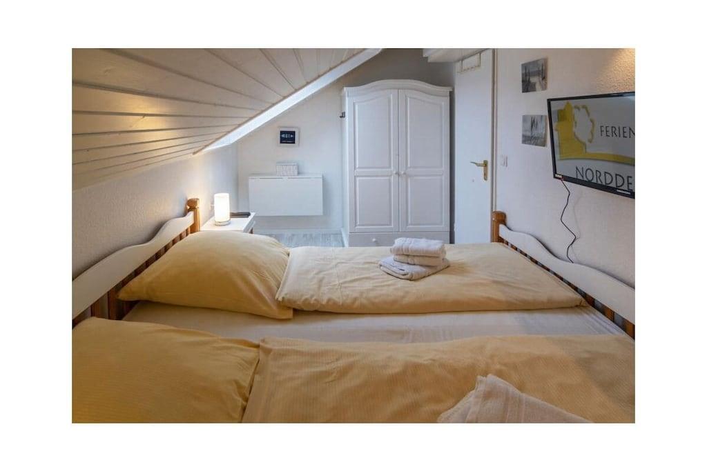 Holiday apartment Marie, Muschelweg 42, Norddeich, 1st floor Norddeich is the perfect environment for a relaxing and varied holiday on the North Sea. In contrast to the city center of Norden, to which the Norddeich district belongs, you will find the peace and quiet you need here. The unique sandy beach is ideal for beach days in summer, but also for long walks in the less warm seasons. The holiday apartment The Marie holiday apartment is on the upper floor of an apartment building in a quiet cul-de-sac and can be reached via a stone spiral staircase. Despite this quiet location, you are not far from everything you could want for a varied North Sea holiday. Just a few steps lead to the Norddeich sandy beach or the popular Dörper Weg with its numerous shops and varied restaurants. Inside your holiday home, functionality and comfort await you in equal measure. The spacious living and dining area is the heart of the apartment. Here you can relax on the sofa, watch the TV program on the TV or use the DVD player for long film evenings. Here you will also find direct access to the terrace, which invites you to linger with a table and comfortable armchairs. Here you will find plenty of shade under the awning on sunny days. Even on cooler days it is pleasant here, the terrace is exclusively equipped with infrared heating. If you do not want to use Norddeich's regional gastronomy, the kitchenette integrated into the living area offers you everything you need for cooking evenings together. The equipment includes a stove with four high burners, an oven, a microwave, a refrigerator, a small dishwasher, a coffee machine, a toaster and enough dishes, cutlery, glasses, etc. A table and a raclette grill are also available. The living area leads to the two bedrooms. The first bedroom