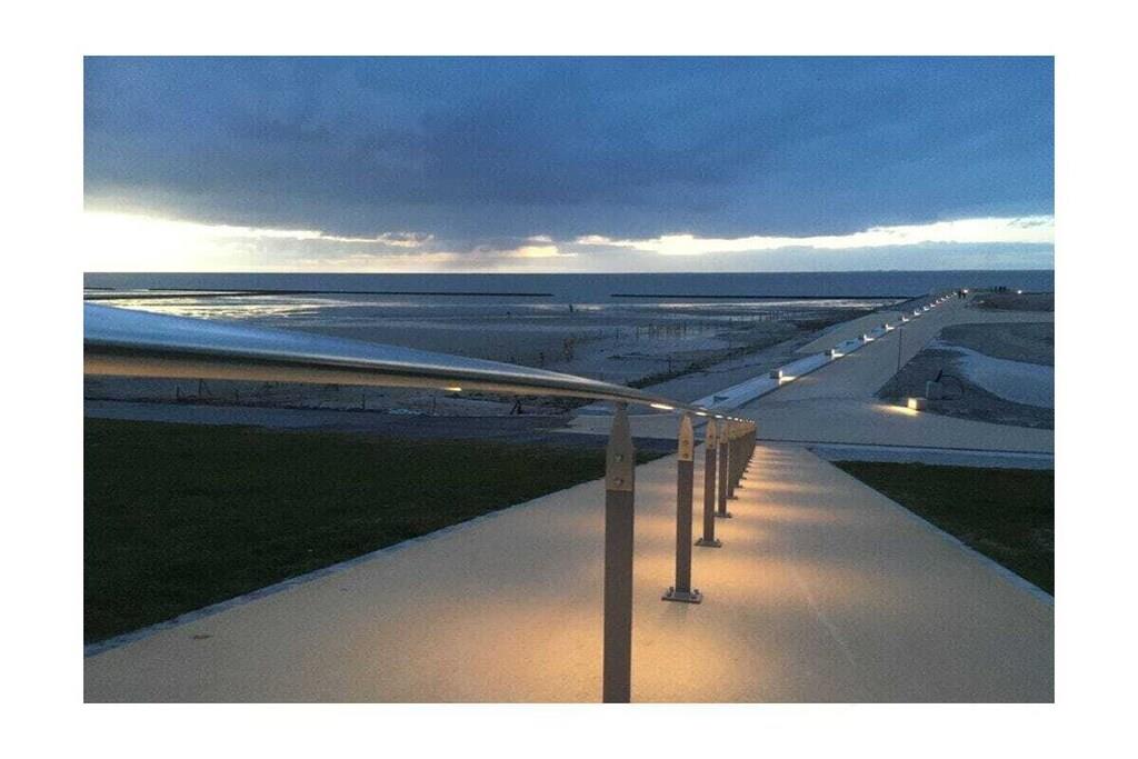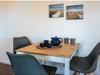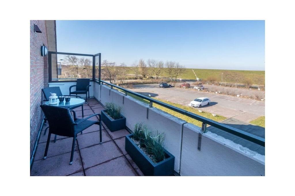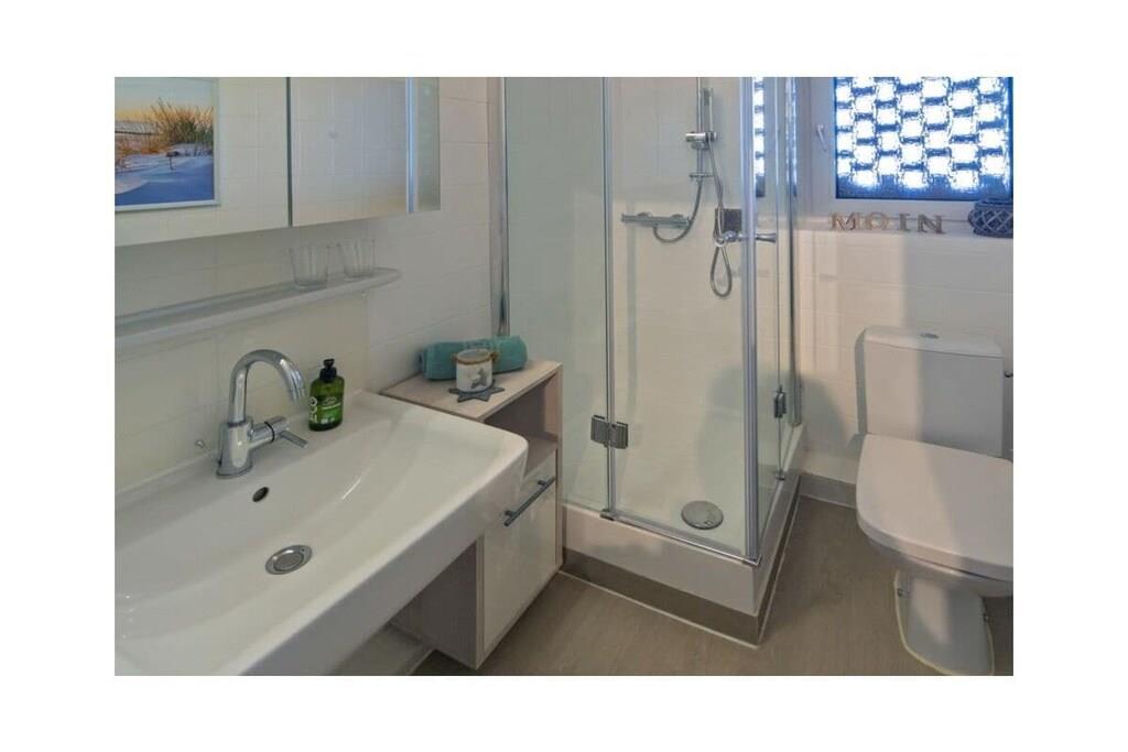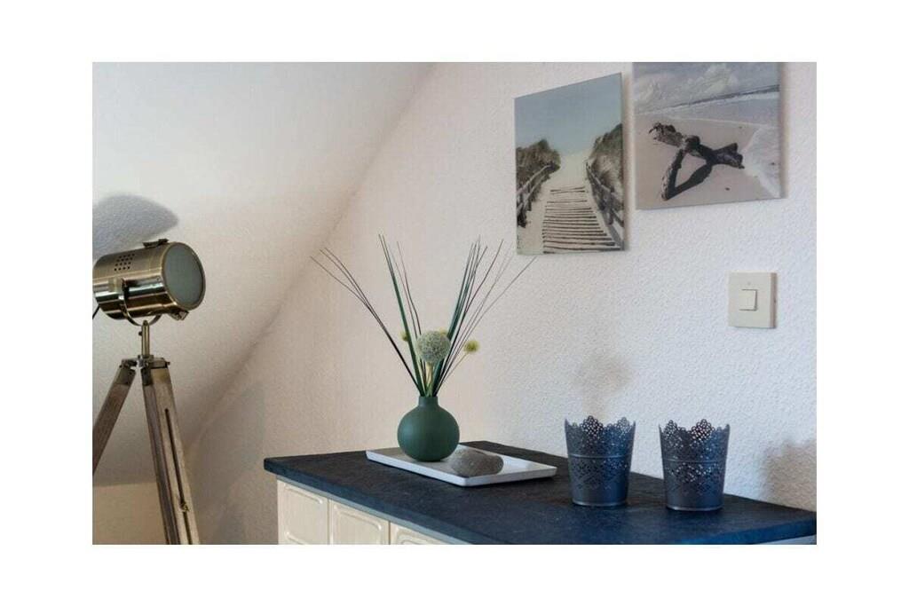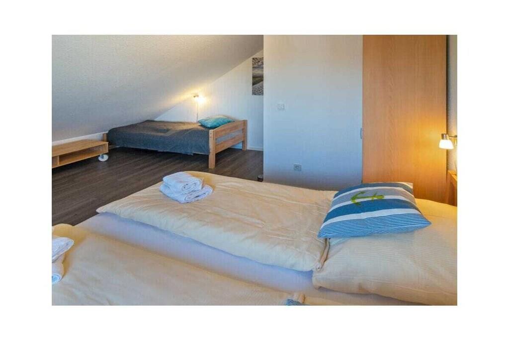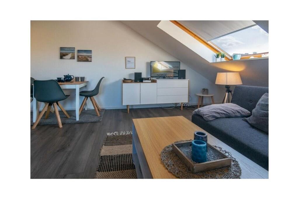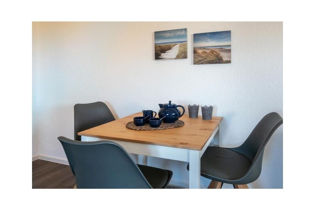 Holiday apartment Watt'n Blick, Deichstraße 14, Norden Enjoy a perfect feel-good holiday in your holiday home in Norddeich. The popular district of the East Frisian town of Norden offers everything you need for a successful combination of relaxation and variety. Just a few meters on foot and you have walked over the dike and are enjoying the wonderful sandy beach and the refreshing breeze of the North Sea. It is also just a few steps to the small but lively center of Norddeich with its shops and attractive restaurants. The holiday apartment Your holiday apartment is on the second floor of an apartment building on Deichstraße and was completely renovated in January and February 2022, directly behind the dike. You can easily reach your home via the staircase. Your parking space is right outside the door. You will notice why the play on words Watt'n Blick was chosen as the name for this apartment when you get to the top and look out of the window. You can enjoy the perfect view of the dike. In addition to this wonderful view, the holiday apartment offers you inviting comfort and functionality - ideal for three people. The heart of the apartment is the spacious living, dining and cooking area with a new kitchen. Here you can relax on the comfortable sofa bed or the cozy armchair, watch TV or try out one of the board games available. You can eat your meals at the dining table with matching chairs. In the integrated kitchenette you will find everything you need for cooking together: a stove with four hotplates, an oven, a refrigerator, a dishwasher, a coffee machine, a toaster and plenty of dishes, glasses and cutlery. A door from the living area leads you directly to the balcony. Here you can relax in the existing seating area and enjoy the soothing North Sea air. The second room of the holiday apartment also leads out to the balcony: the
