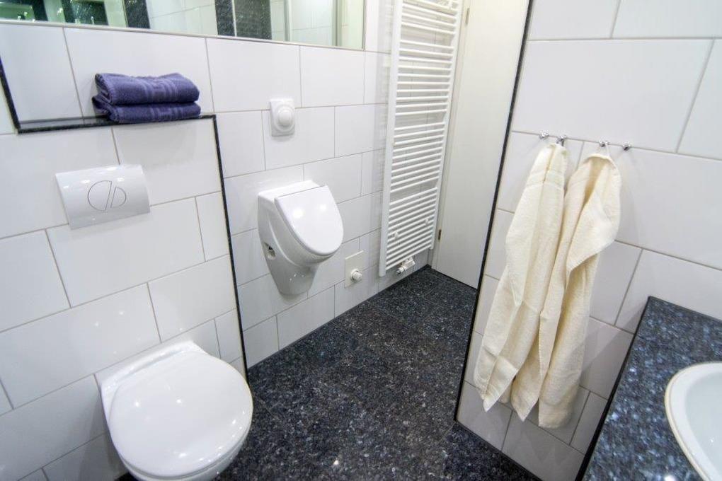 Dusche, Hänge-WC und ein Urinal Becken sowie Fußbodenheizung, Waschkombination mit großem Spiegel, Föhn.