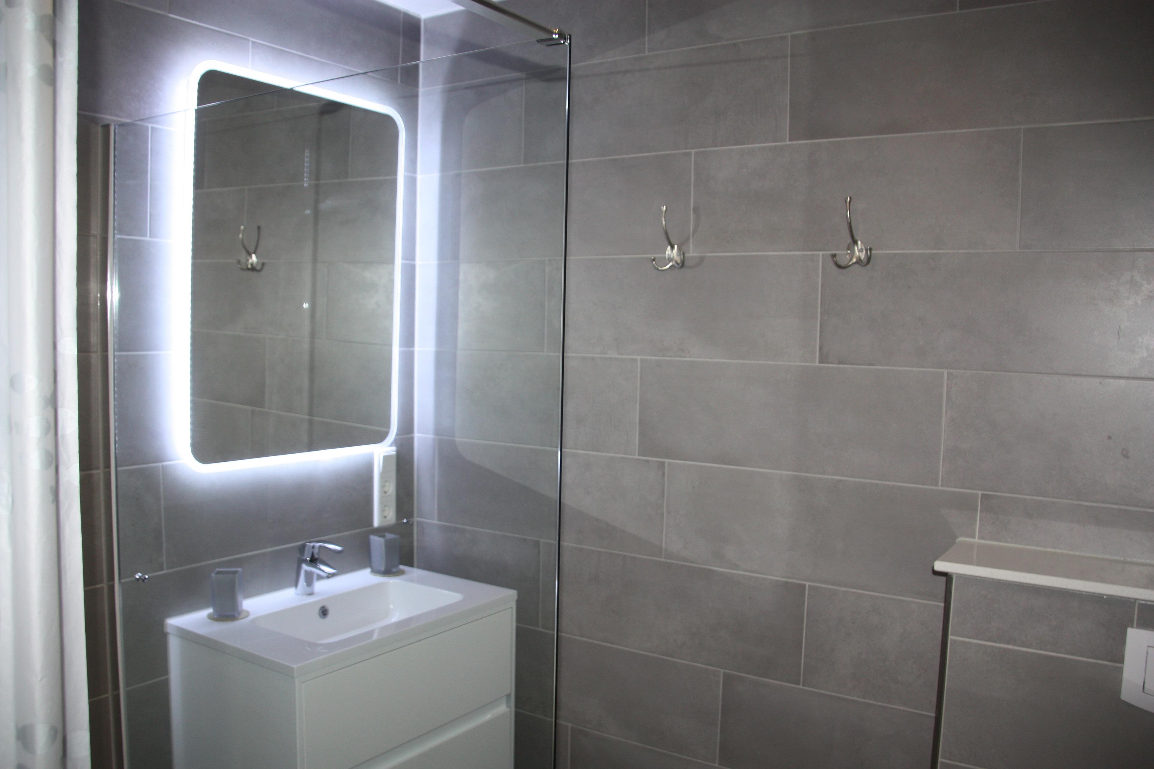 Das traumhafte, hell geflieste Badezimmer mit ebenerdiger Dusche lädt zum Entspannen ein.