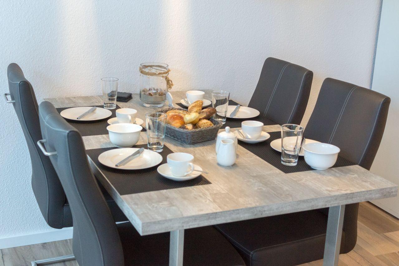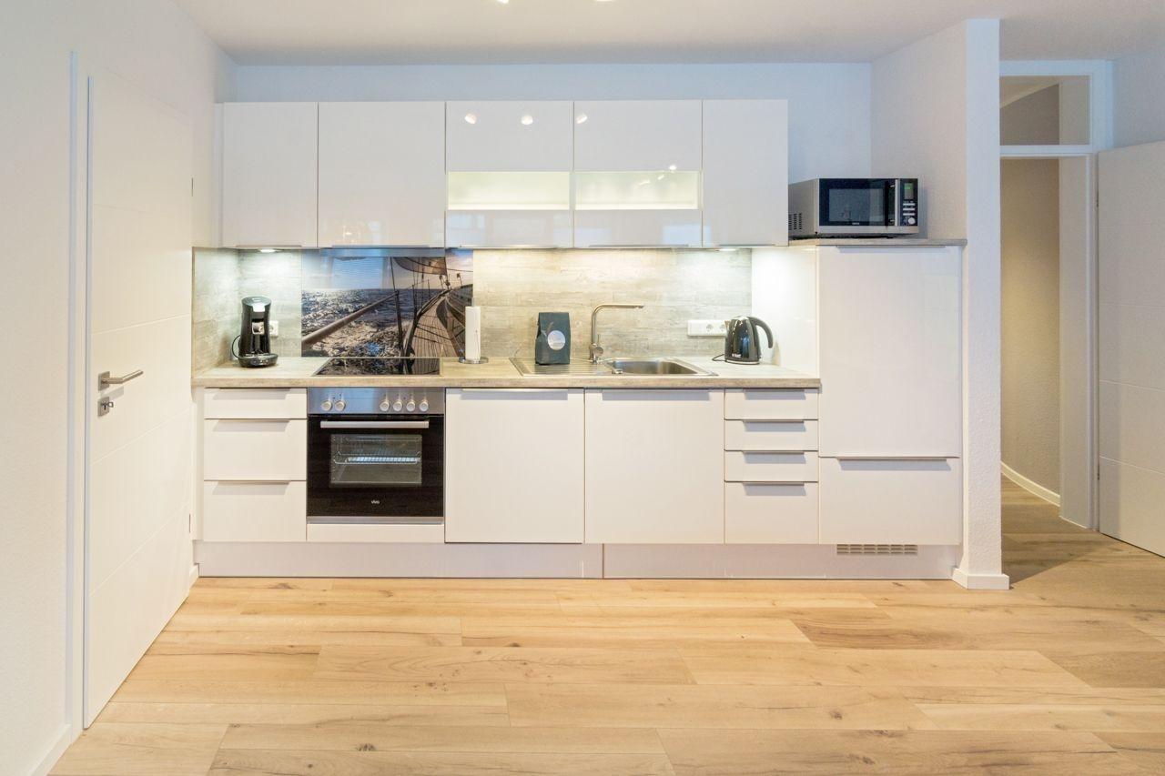 Voll ausgestattet erwartet Sie auch die schicke Einbauküche. Neben den üblichen Gerätschaften und Kochutensilien dürfen Sie sich auf zusätzlichen Komfort wie eine Senseo-Pad-Maschine, eine Mikrowelle oder einen Geschirrspülautomaten freuen.