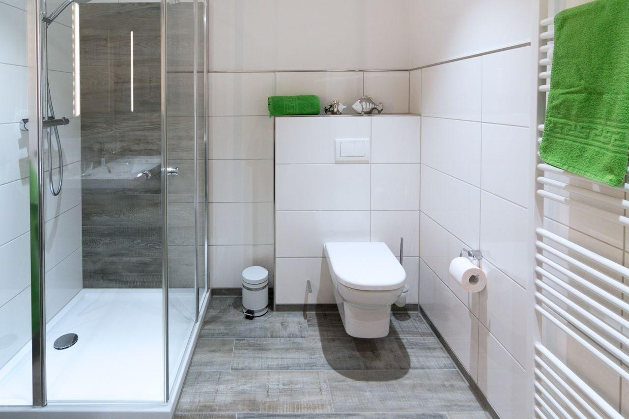 Ein besonderes Highlight ist auch das großzügige moderne Badezimmer. Hier befindet sich eine Glasdusche mit Rainshower-Duschsystem. Annehmlichkeiten wie Fußbodenheizung und Handtuchtrockner dürfen ebenfalls nicht fehlen.
