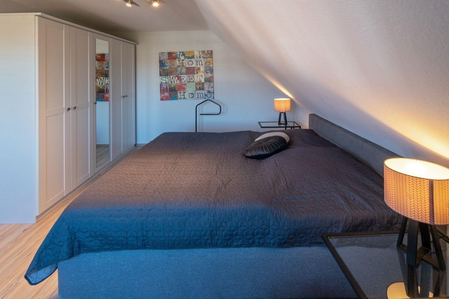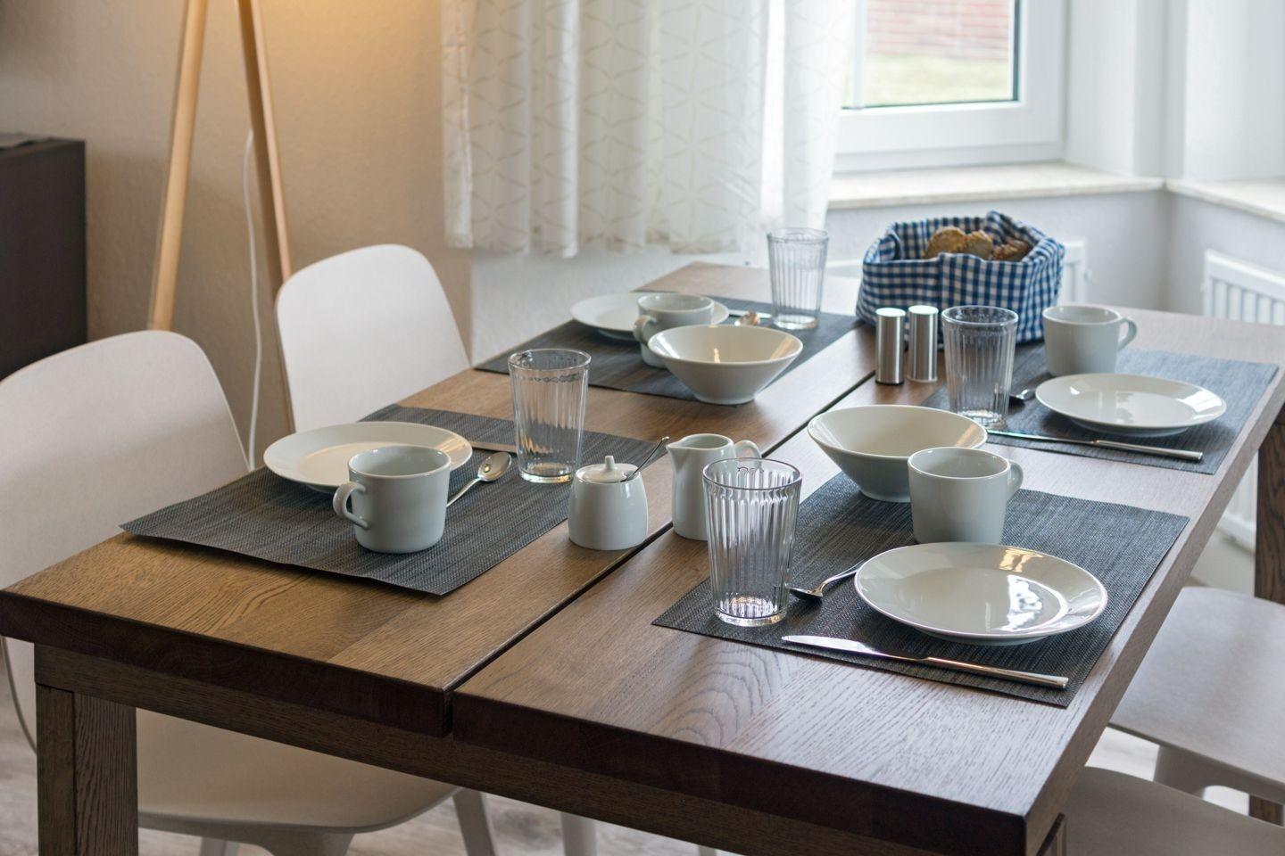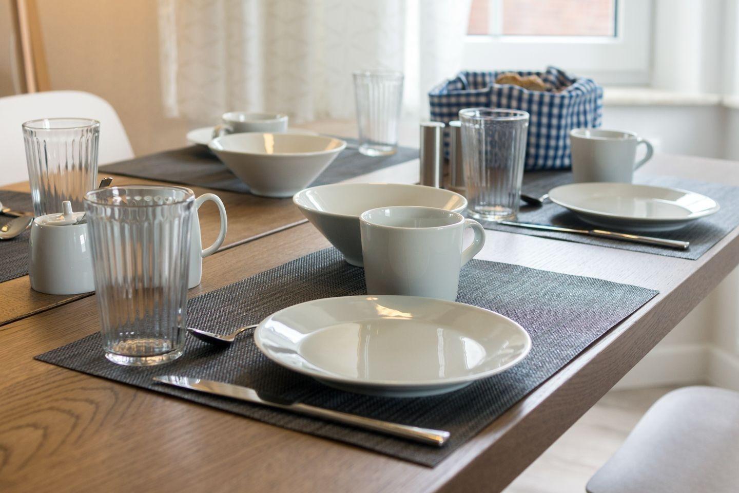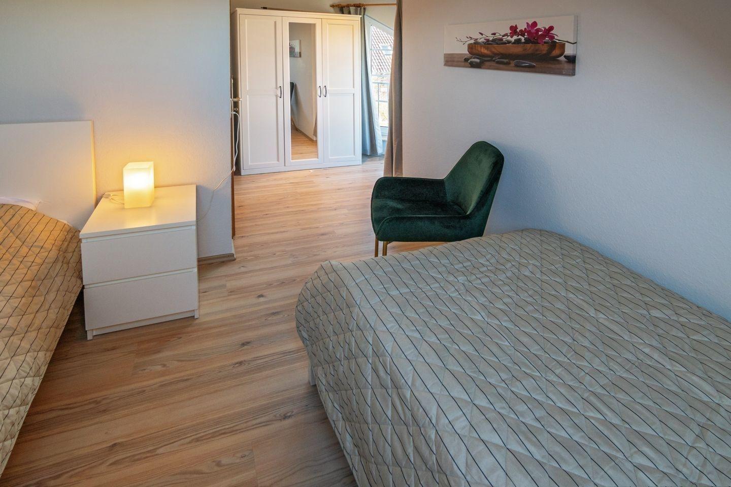Die Ferienwohnung bietet ein modernes und allergikergeeignetes Ambiente mit zwei Schlafzimmern, in denen sich ein Doppelbett und zwei Einzelbetten befinden. Die offene Küche ist mit einem Geschirrspüler, einem Elektro-/Gasherd, einem Backofen, einer Mikrowelle, einem Kühlschrank und einer Kaffeemaschine ausgestattet. Ein Frühstückstisch mit Geschirr und Besteck lädt zu gemeinsamen Mahlzeiten ein. In dem hellen Duschbad mit Fenster stehen ein Haartrockner und ein Gäste-WC zur Verfügung. Der gemütliche Wohnbereich verfügt über ein Sofa, einen Sessel und eine HiFi-Anlage sowie einen TV. Internet mit WLAN sorgt für eine reibungslose Verbindung. Ein Parkplatz ist ebenfalls vorhanden. Praktische Extras wie eine Waschmaschine, ein Wasserkocher, ein Toaster, ein Kinderhochstuhl und eine Garderobe runden das Angebot ab. Die zentrale Lage der Wohnung ermöglicht einen entspannten Urlaub für die ganze Familie.