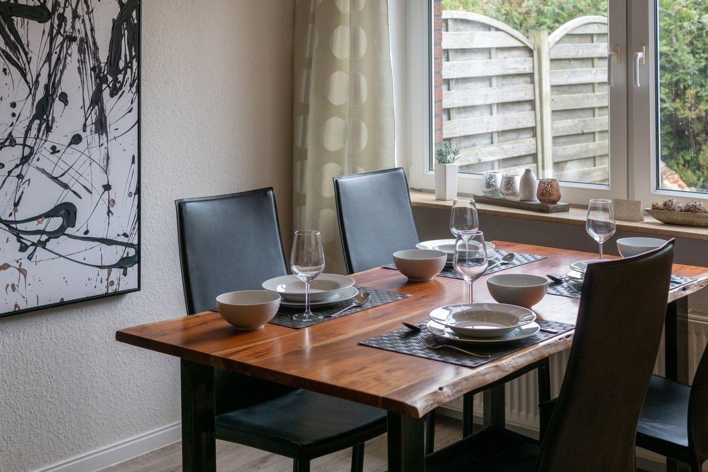 Die Ferienwohnung bietet einen entspannenden Gartenblick und ist ideal für Familien oder Gruppen bis zu vier Personen, perfekt gelegen für unvergessliche Urlaubserlebnisse in der Nähe von Norddeich.