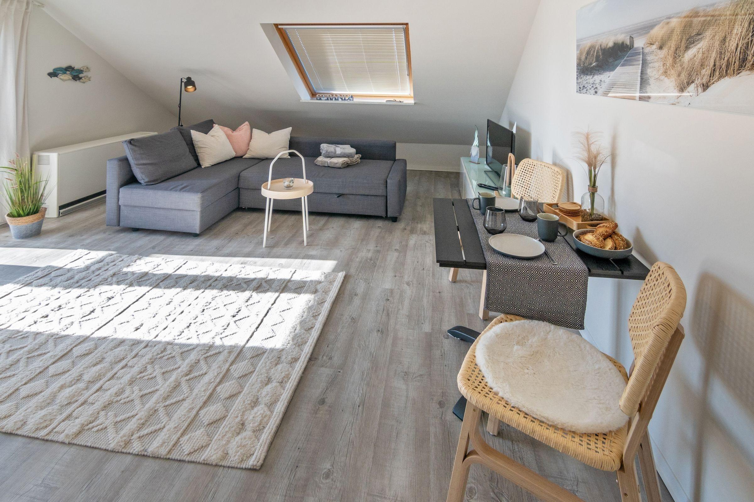 Diese charmante Ferienwohnung bietet eine helle und einladende Atmosphäre, ideal für einen erholsamen Aufenthalt. Der offene Küchenbereich ist modern ausgestattet und verfügt über einen Elektro-/Gasherd, Kühlschrank, Geschirrspüler sowie eine Kaffeemaschine und einen Toaster. Im behaglichen Schlafzimmer sorgt ein komfortables Doppelbett für eine entspannte Nachtruhe. Das Badezimmer mit Fenster ist mit einer Duschbadewanne ausgestattet und bietet einen Spiegel.
