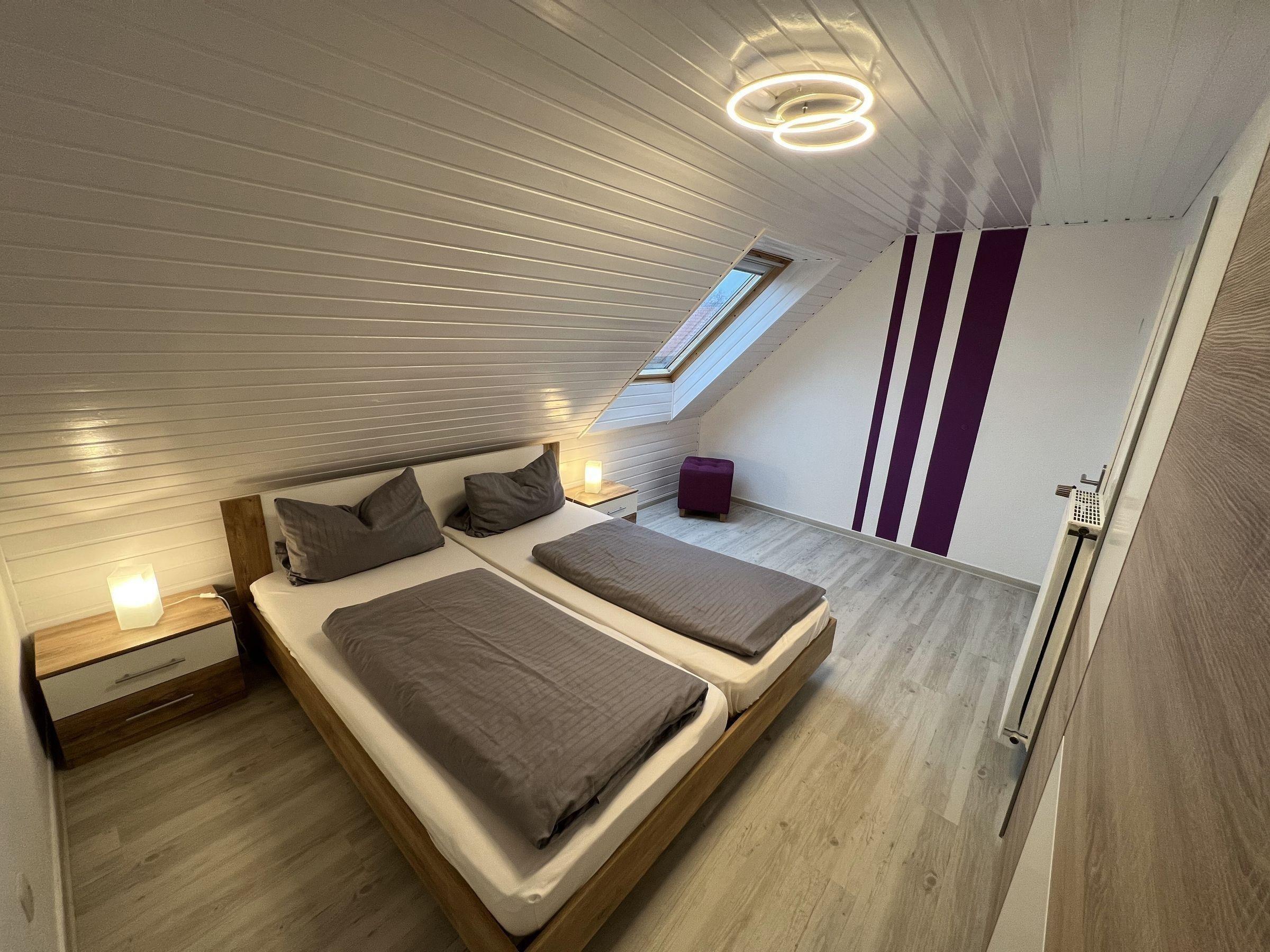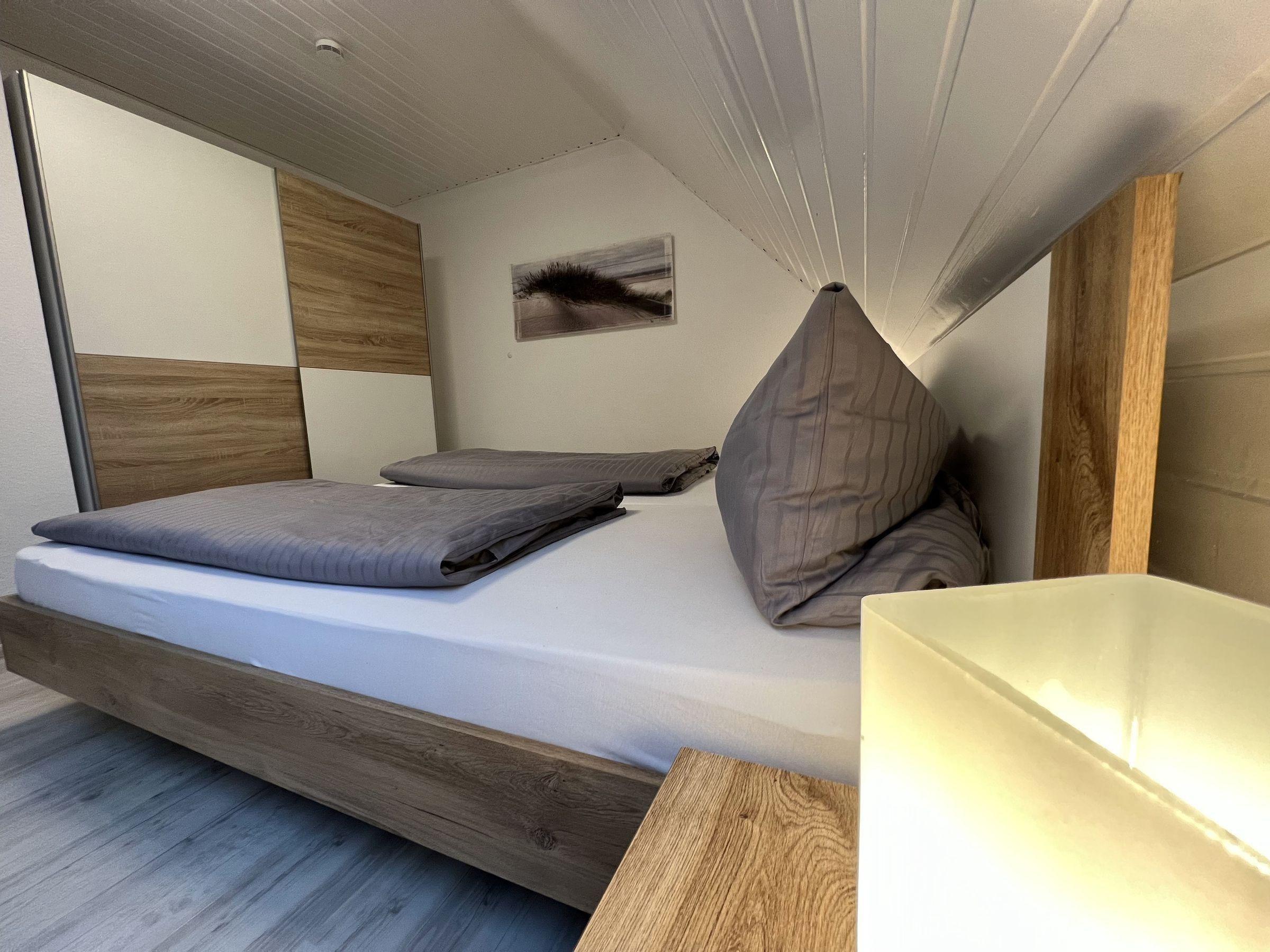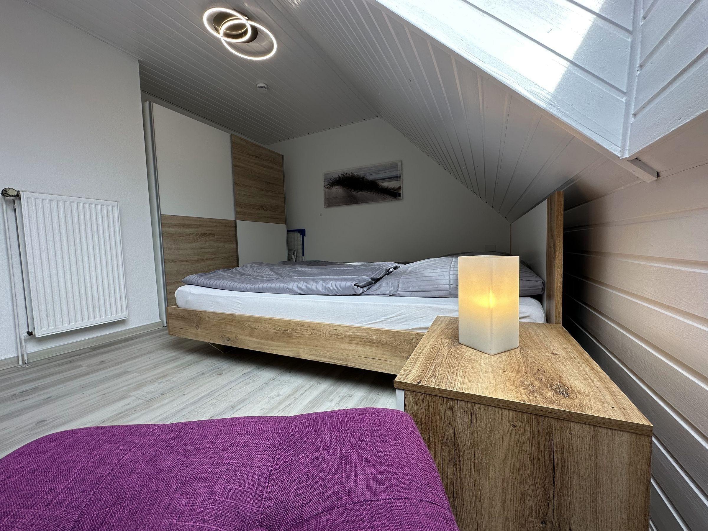 Weiter gehören zur Wohnung 2 freundliche Schlafzimmer mit jeweils einem Doppelbett. Das zweite Schlafzimmer im ausgebauten Dachgeschoss ist über eine Raumspartreppe zu erreichen. Das moderne Badezimmer hat eine Dusche, Waschbecken und WC.