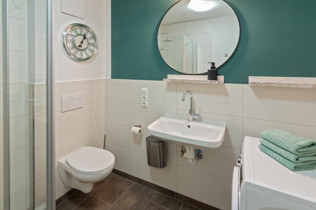 Das große Badezimmer hat kein Fenster, eine bodennahe Dusche, WC + Spiegel mit Unterschrank. Die Waschmaschine steht hier.
