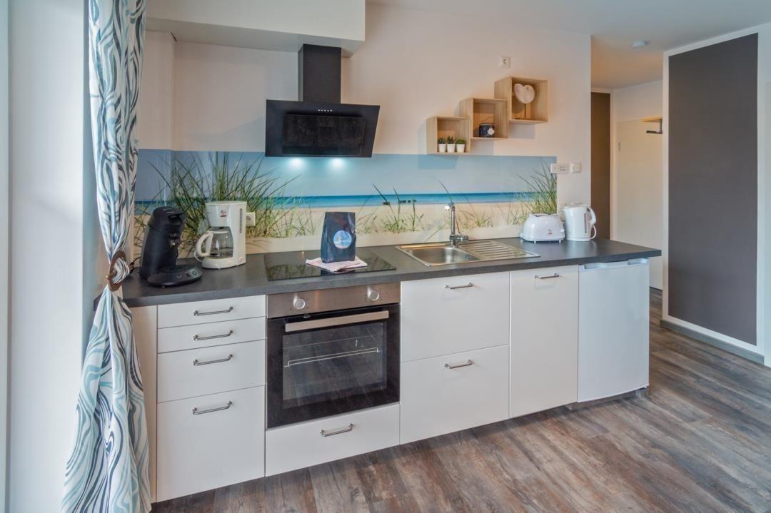 Die moderne Küche ist großzügig und gut ausgestattet mit einem Herd, Spülmaschine, Kaffeemaschine, Kühlschrank, Mikrowelle, Backofen, Toaster, Geschirr, Gläser, etc. Ein runder Tisch mit 4 Stühlen bietet Platz für Mahlzeiten und Spieleabende.