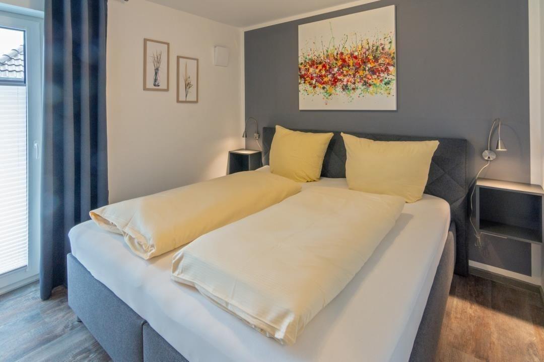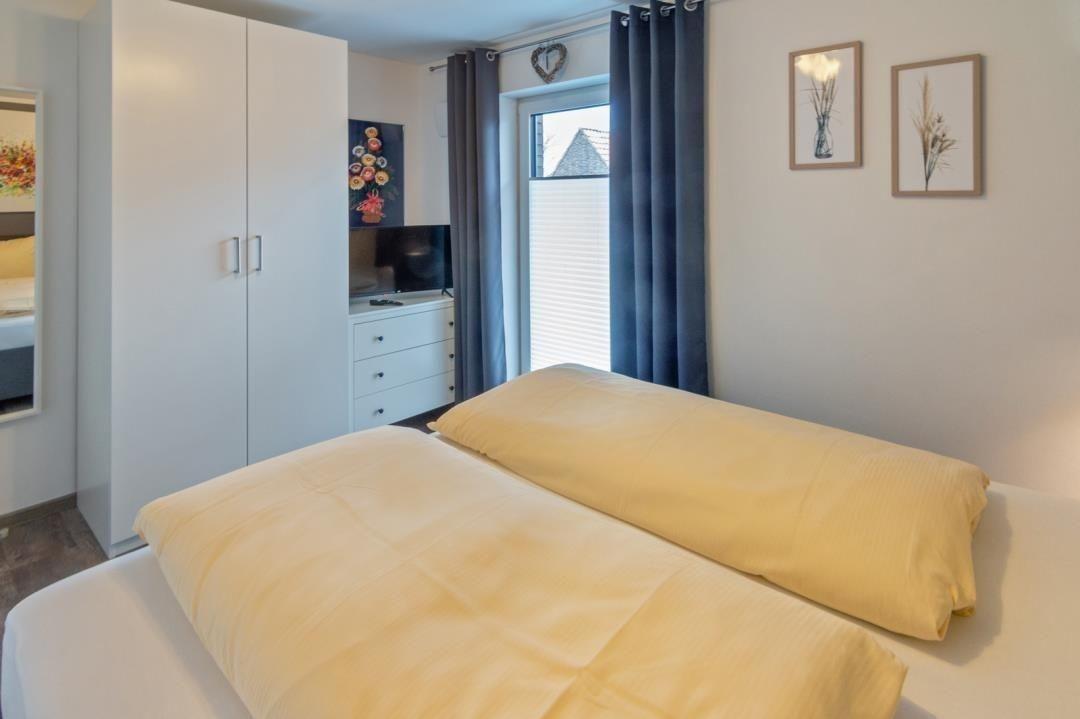 Im Schlafzimmer steht ein 180 x 200 cm Doppelbett. Ein Kleiderschrank bietet Platz für ihre Garderobe. Ein großer Spiegel und eine Kommode runden die Einrichtung ab.