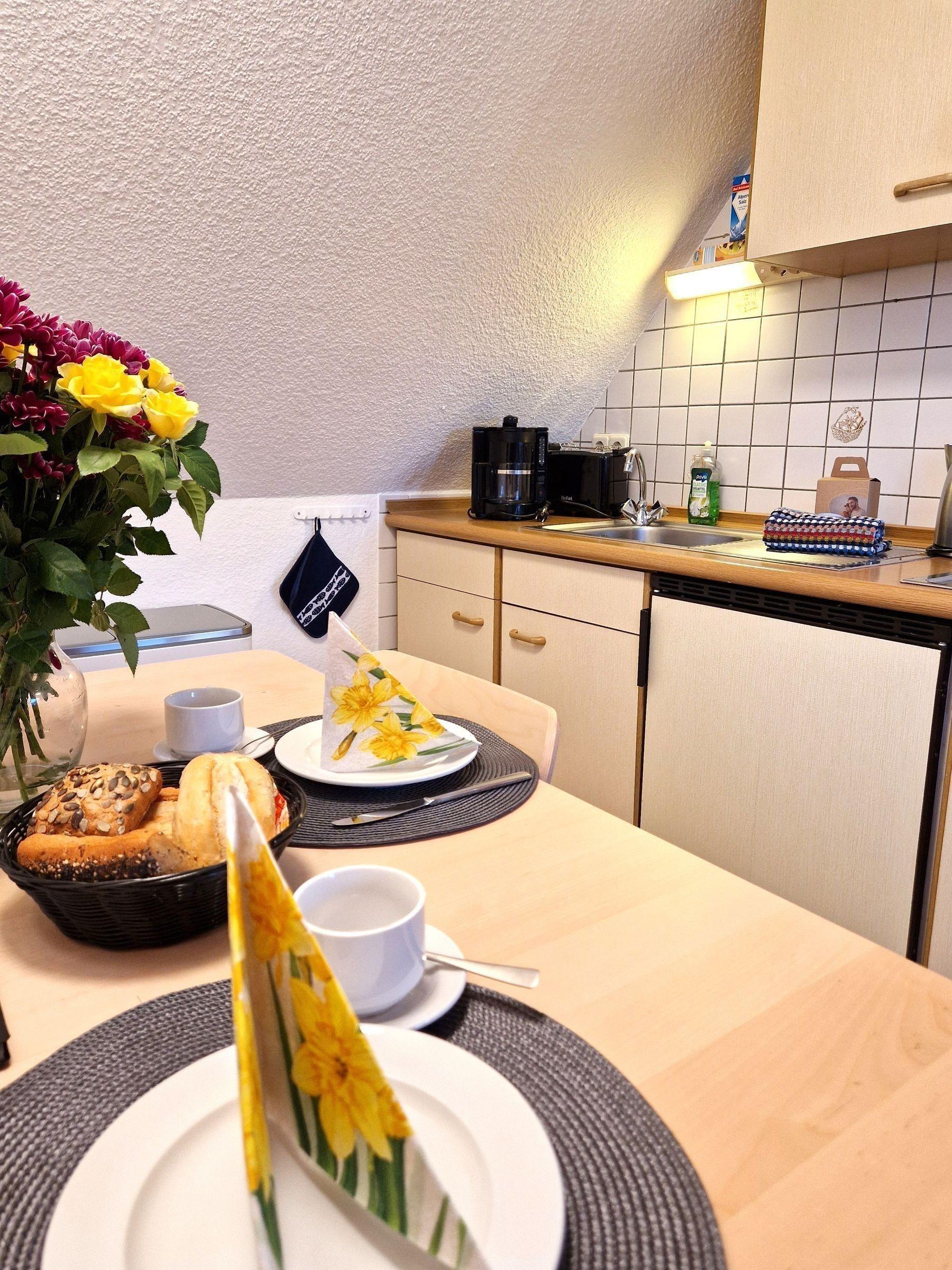 In dieser gemütlichen Ferienwohnung erwartet den Gast eine moderne Ausstattung, die keinen Wunsch offenlässt. Zwei liebevoll eingerichtete Schlafzimmer bieten Platz für bis zu drei Personen, ausgestattet mit einem komfortablen Doppelbett und einem Einzelbett. Die offene Küche ist für Selbstversorger ideal und verfügt über einen Elektro- und Gasherd, eine Mikrowelle, einen Kühlschrank, eine Kaffeemaschine, einen Toaster sowie Gefriermöglichkeiten – alles, was für die Zubereitung köstlicher Mahlzeiten benötigt wird. Ein heller Esstisch lädt zum Verweilen ein, während das Badezimmer mit Fenster und Duschbad für Erholung sorgt. Der Wohnbereich ist mit einem Sofa und Sessel ausgestattet, ideal für entspannte Abende. WLAN sorgt für Internetzugang, und die HiFi-Anlage sowie der Fernseher bieten Unterhaltung. Ein Parkplatz steht zur Verfügung, und die Wohnung ist allergikergeeignet, was den Aufenthalt zusätzlich angenehm gestaltet.