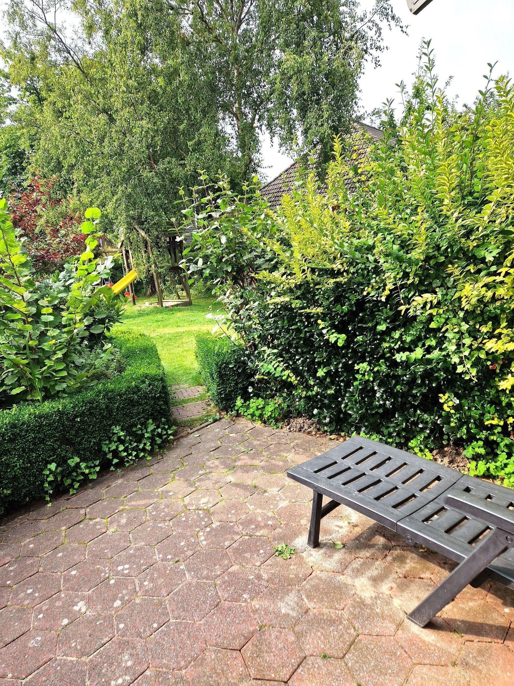 Die Ferienwohnung verfügt über einen privaten Außenbereich mit einer einladenden Terrasse. Dort findet sich eine großzügige Liegewiese, ideal zum Entspannen. Für die kleinen Gäste steht ein Spielplatz mit einer Schaukel und einem Sandkasten bereit, der zum Spielen und Toben einlädt. Diese Kombination bietet sowohl Ruhe als auch Spaß für die ganze Familie.