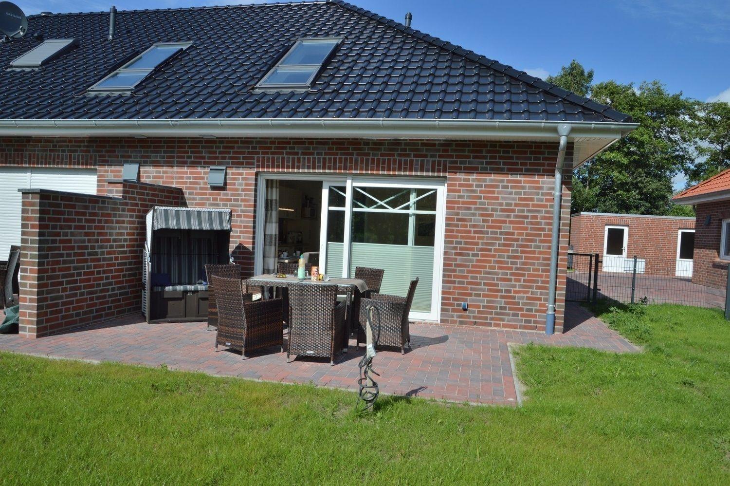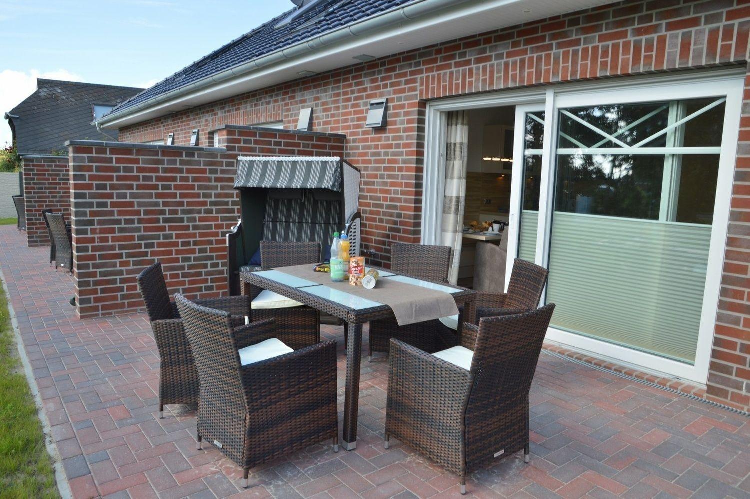 Auf der Terrasse warten bereits gemütliche Rattangartenmöbel, ein Strandkorb, ein Holzkohlegrill und ein Sonnenschirm auf Sie.