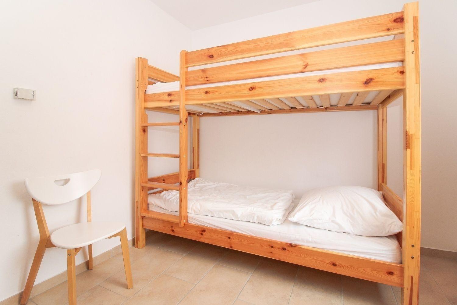 Das Elternschlafzimmer ist mit einem großen Doppelbett, Kleiderschrank und Nachtkonsolen ausgestattet. Das Kinderzimmer verfügt über ein Hochbett, Spieltisch und Kleiderschrank. Im dritten Schlafzimmer finden Sie ein weiteres Einzelbett sowie Nachtkonsole und Kleiderschrank. Alle Zimmer lassen sich mit Außenjalousien verdunkeln.