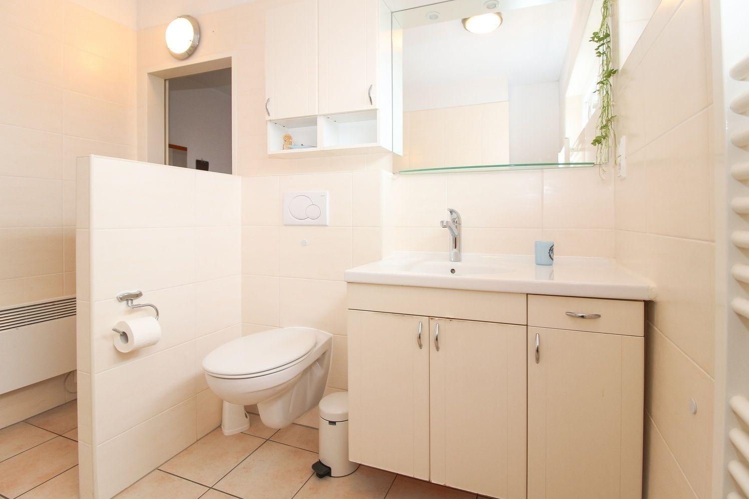 Das große und helle Bad verfügt über eine ebenerdige Dusche. Hier steht Ihnen auch kostenlos eine Waschmaschine zur Verfügung.