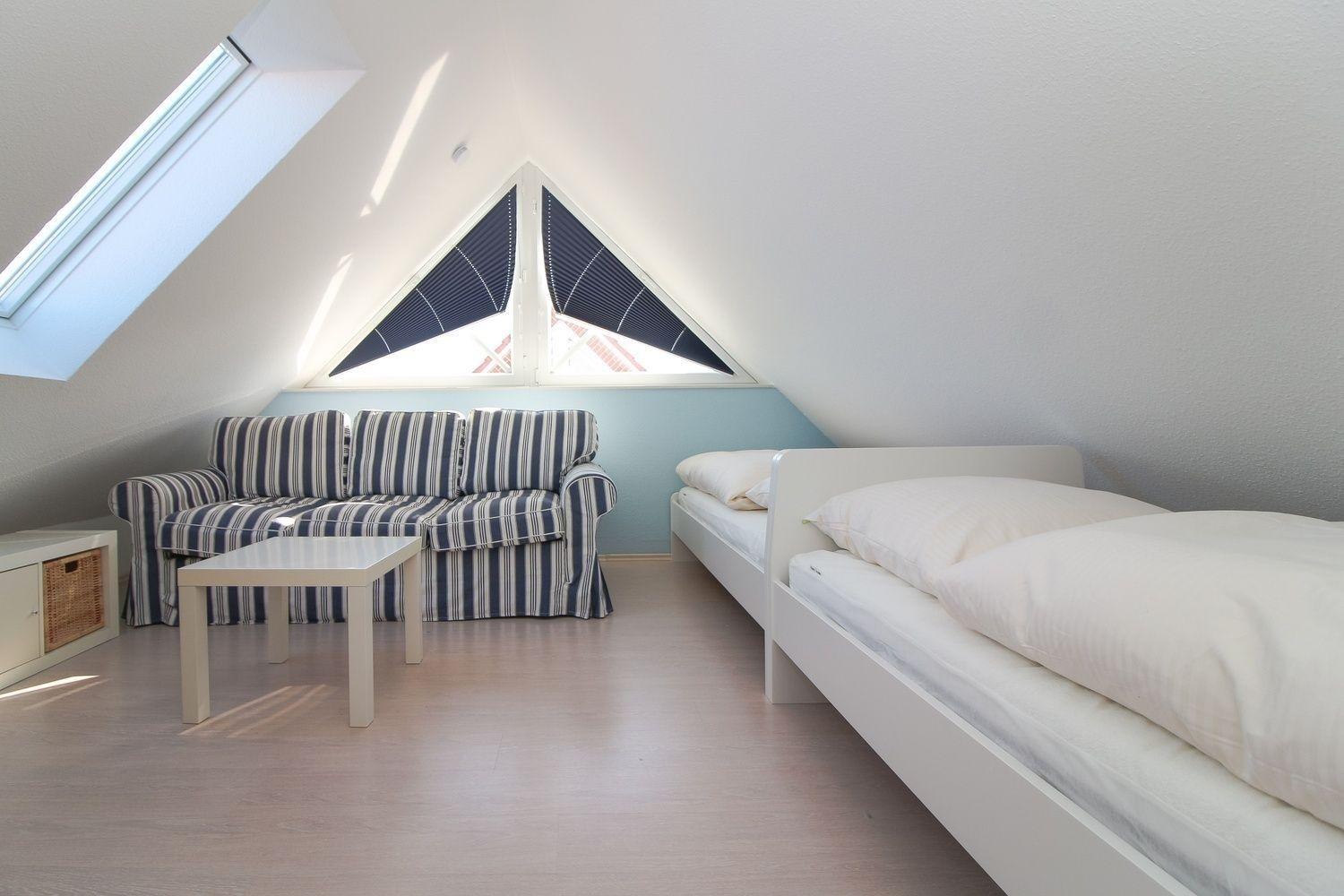 Über die Raumspartreppe im Wohnbereich gelangen Sie in das zweite, lichtdurchflutete Schlafzimmer mit zwei Einzelbetten. Auch ein großes Ostfriesensofa hat hier seinen Platz und bietet einen optimalen Blick auf den Fernseher. In der kälteren Jahreszeit sorgt die Fußbodenheizung für wohlige Wärme.
