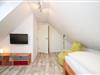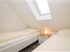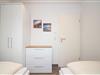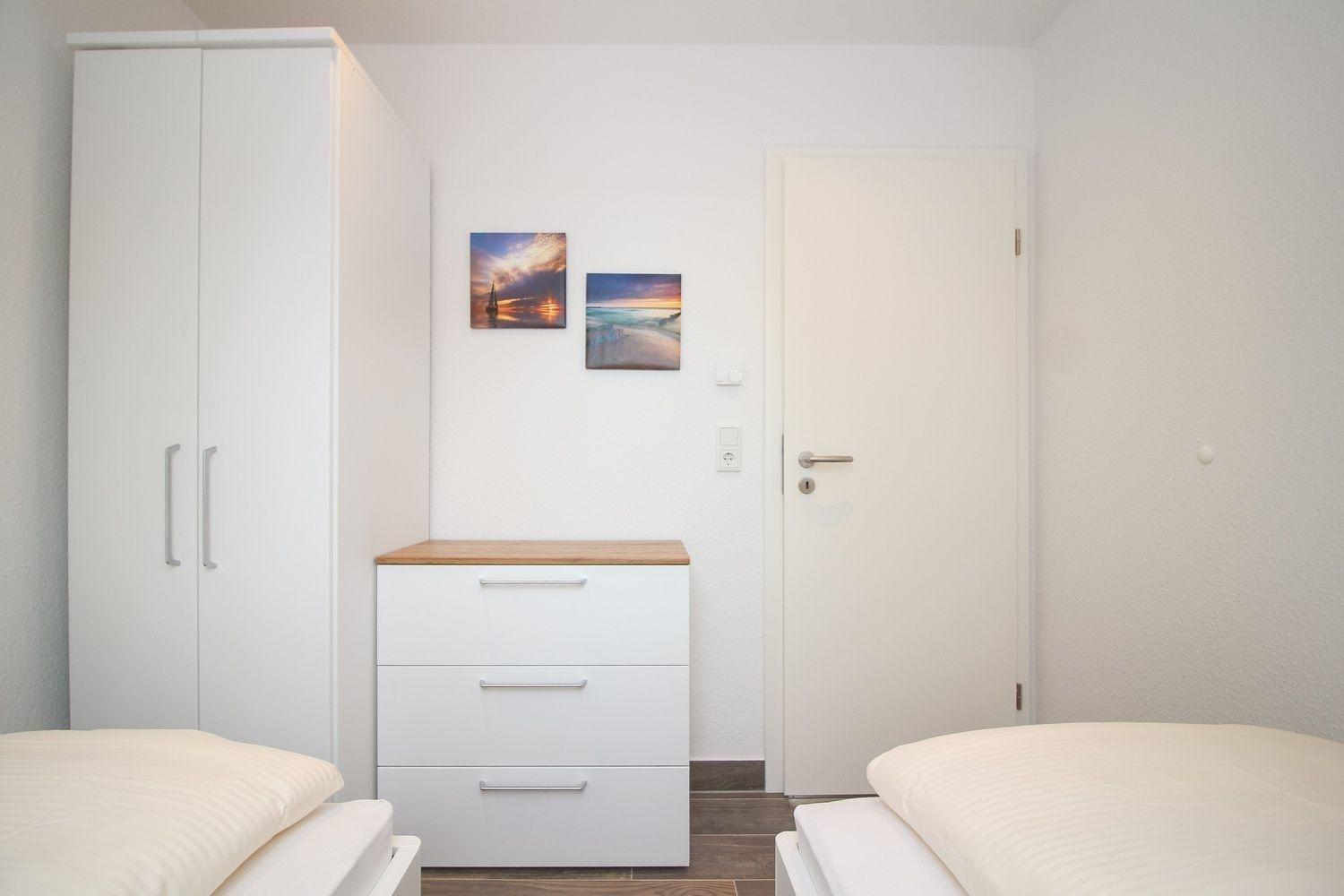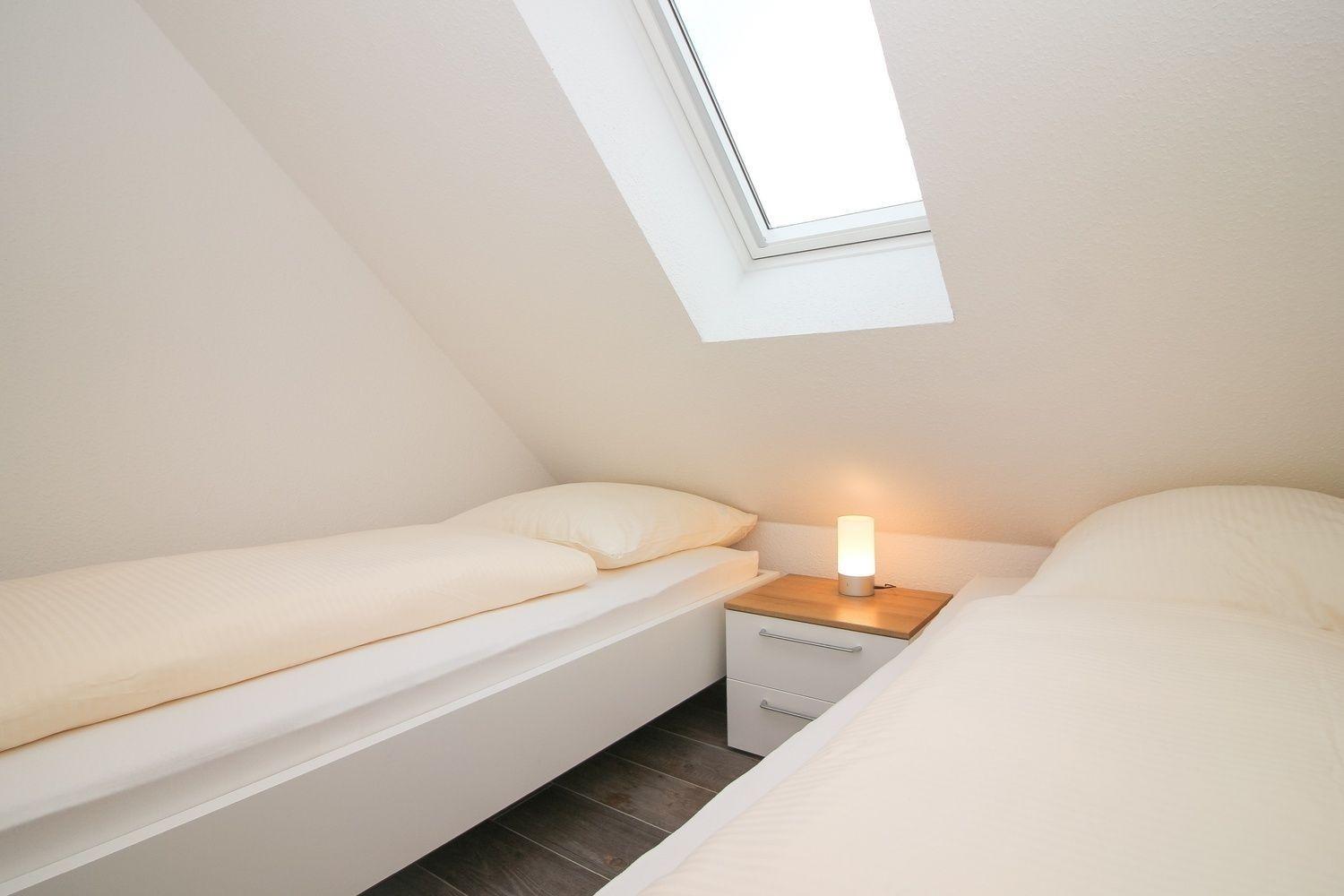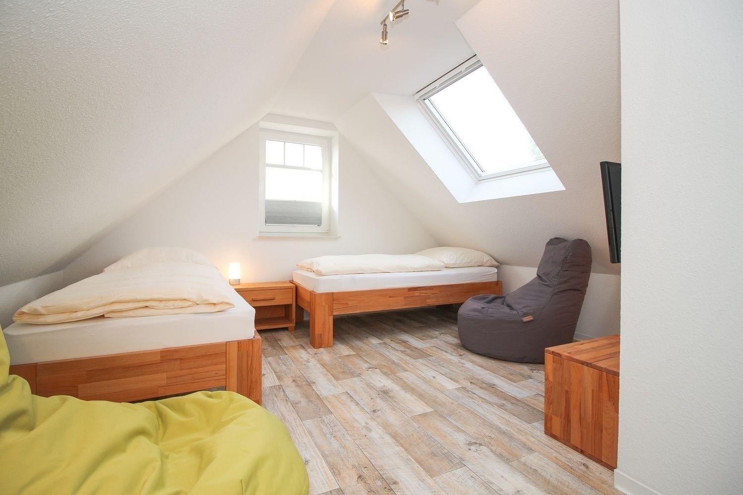 Über die Treppe im Eingangsbereich erreichen Sie im Obergeschoss ein weiteres Schlafzimmer mit zwei Einzelbetten. Der durch die zwei großen Fenster ausgesprochen helle Raum lädt mit seinen gemütlichen Sitzsäcken auch tagsüber zum Verweilen ein.
