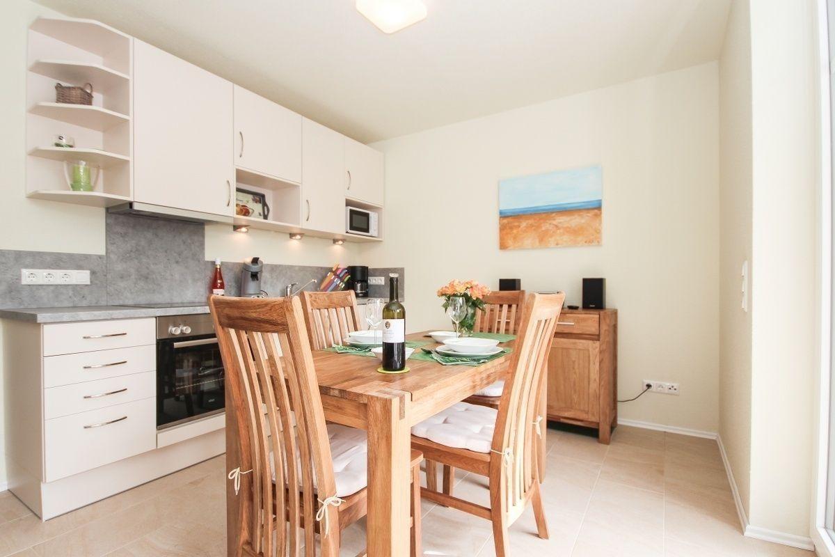 Die Wohnung ist modern und individuell eingerichtet; sie bietet allen Komfort, den sich ein Feriengast wünscht: im Wohnbereich ist eine komplett eingerichtete Einbauküche mit Kühlschrank und Gefrierfach, Ceranfeld mit Backofen, Mikrowelle, Wasserkocher, Geschirrspülmaschine, Kaffeemaschine, Mixer, Toaster, Senseomaschine, Bügeleisen.