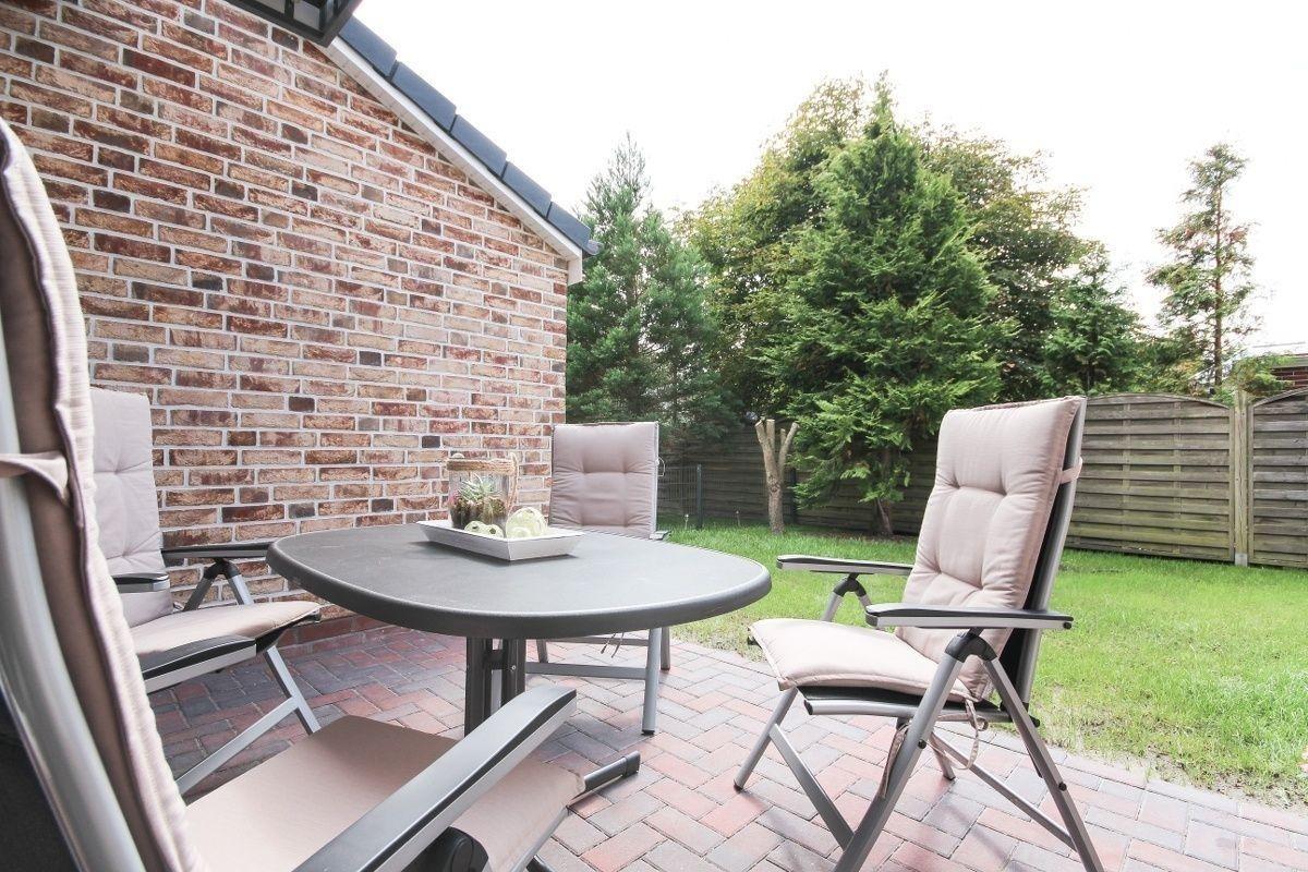 Die Terrasse, ausgestattet mit einem Gartentisch und (verstellbaren) Stühlen, ist windgeschützt. Die Sonne scheint hier von mittags bis abends.