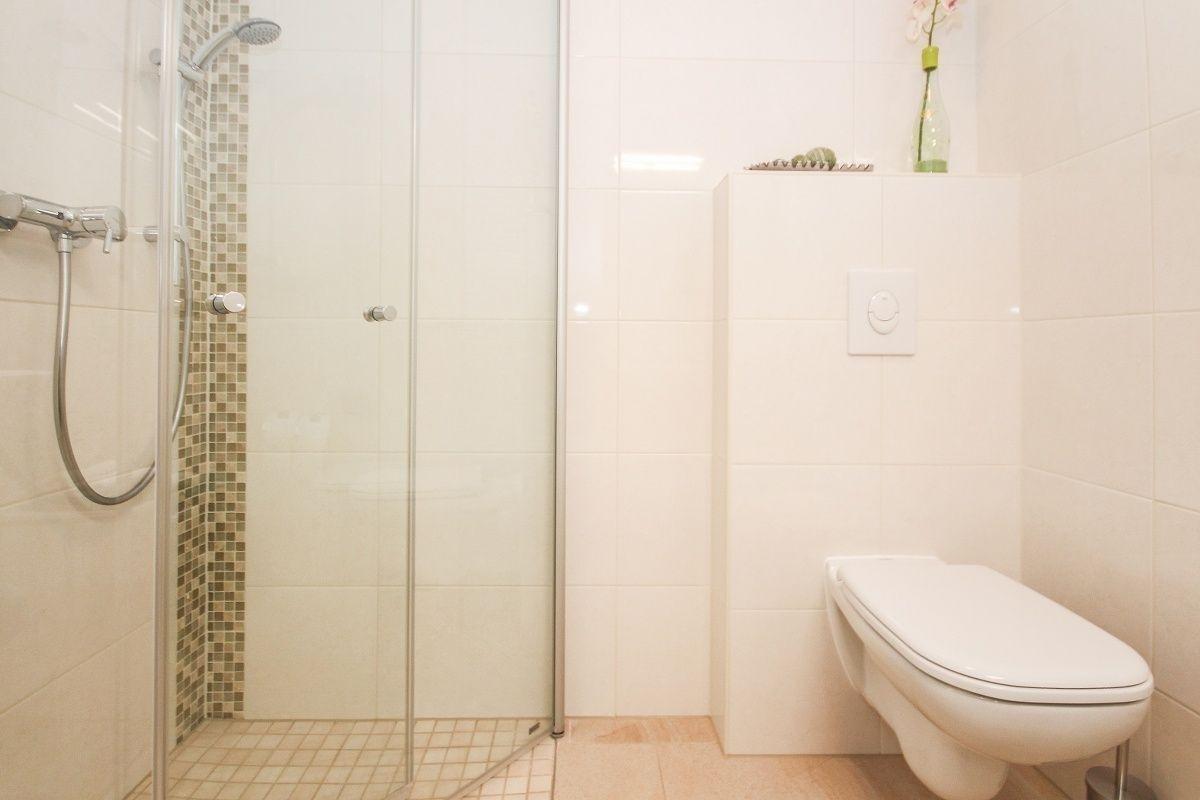 Im Bad duschen Sie in der großen ebenerdigen Dusche. Weitere Annehmlichkeiten sind die Fußbodenheizung in allen Räumen und elektrisch zu bedienende Rolladen.
