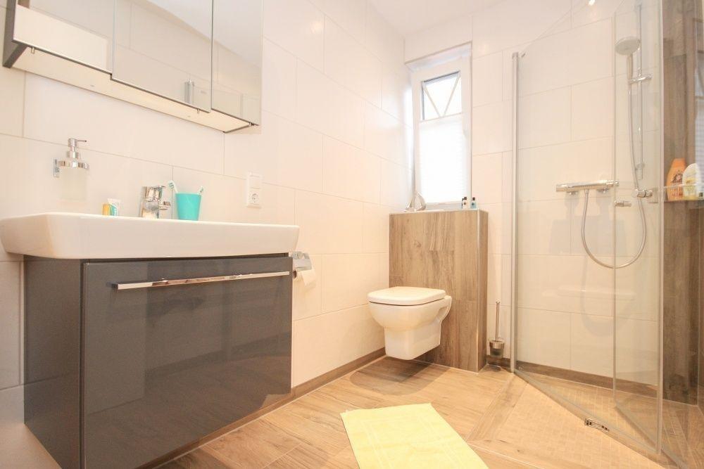 Das topmoderne Bad ist lichtdurchflutet und lädt mit seiner ebenerdigen Dusche zur entspannenden, täglichen Körperpflege ein.