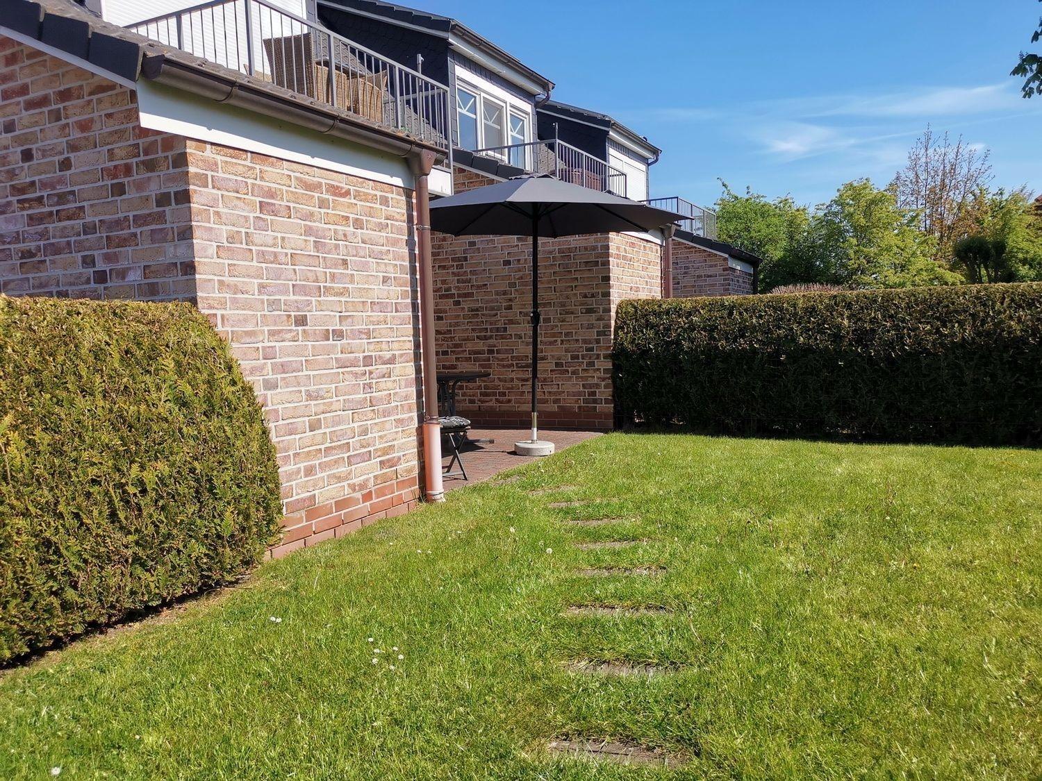 Auf der Terrasse mit Gartenmöbeln und Sonnenschirm können Sie Ihre Seele baumeln lassen. Auch die Utensilien für einen lauen Grillabend sind vorhanden.