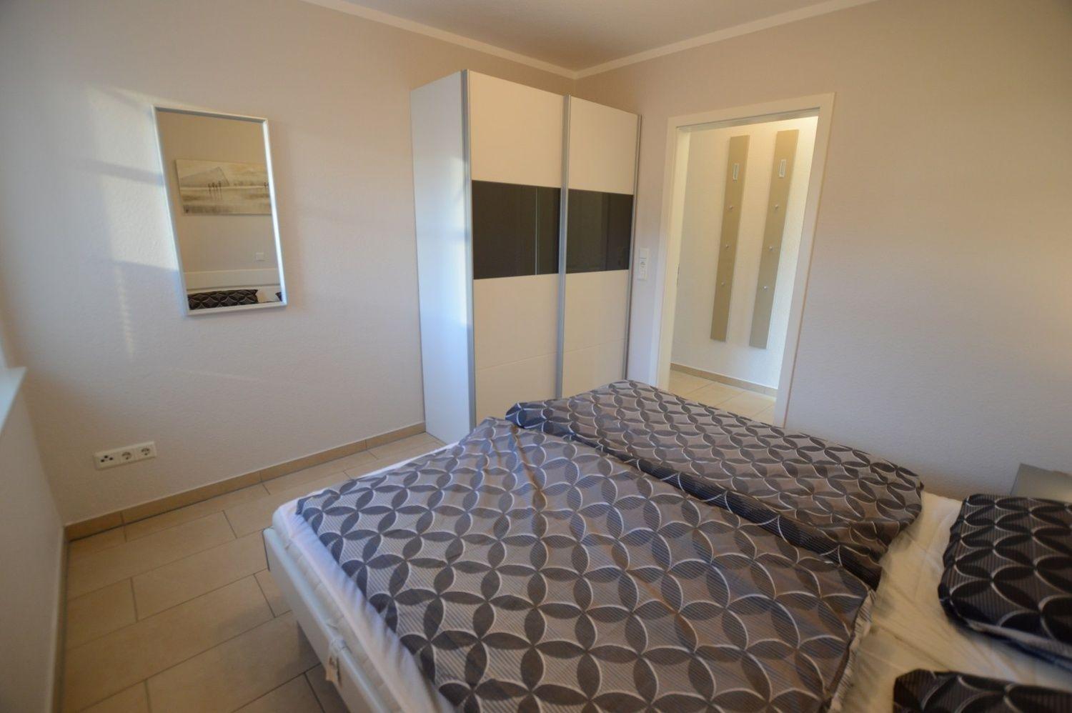Im geräumigen Schlafzimmer befindet sich ein 1,80 x 2,00m großes Doppelbett mit verstellbarem Lattenrost und Kaltschaummatratze, ein Kleiderschrank, Nachtschränkchen und Radiowecker.