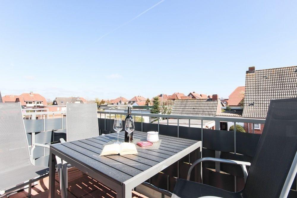 Vom Wohnzimmer gelangen Sie auf den mit Gartenmöbel ausgestatteten Balkon.