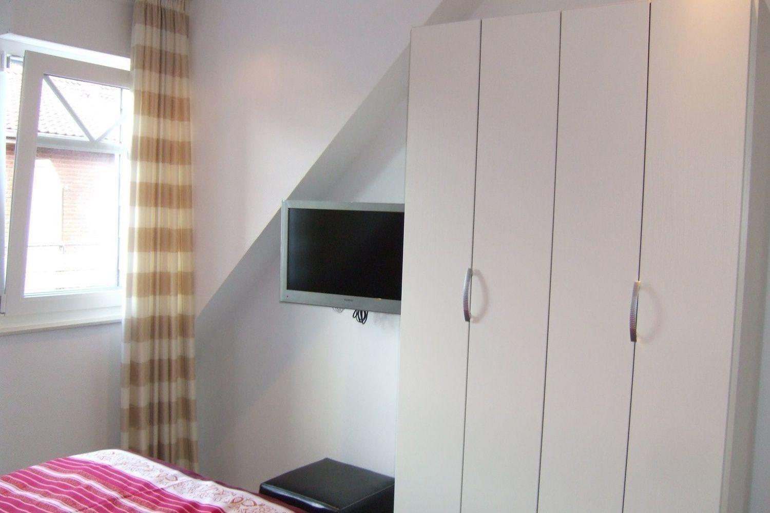 Im Schlafzimmer ist ein 1.80 x 2.00m großes Doppelbett ohne Fußteil, ein Kleiderschrank , Wecker mit Dockingstation und ein Flachbildschirm - TV vorhanden.