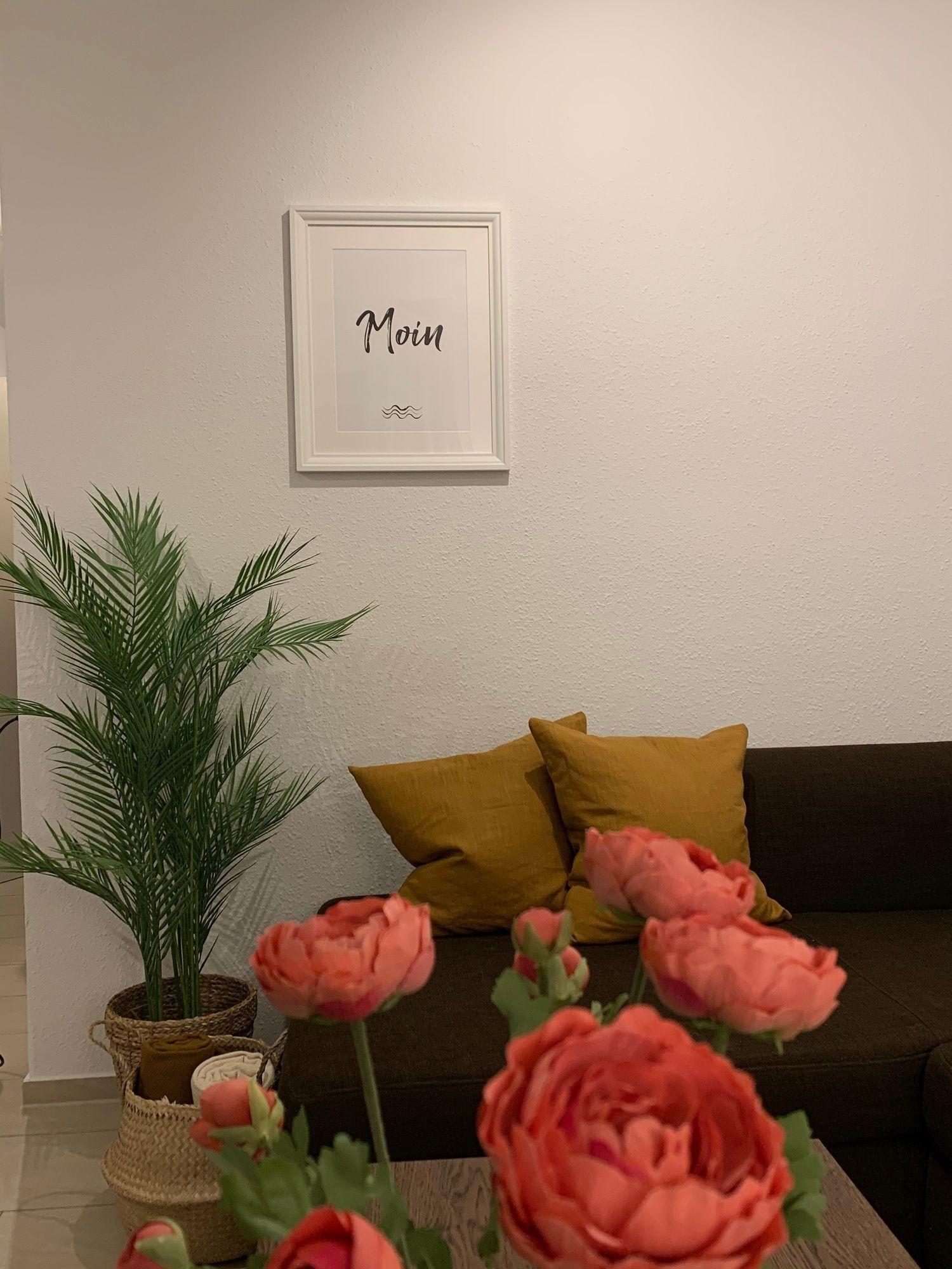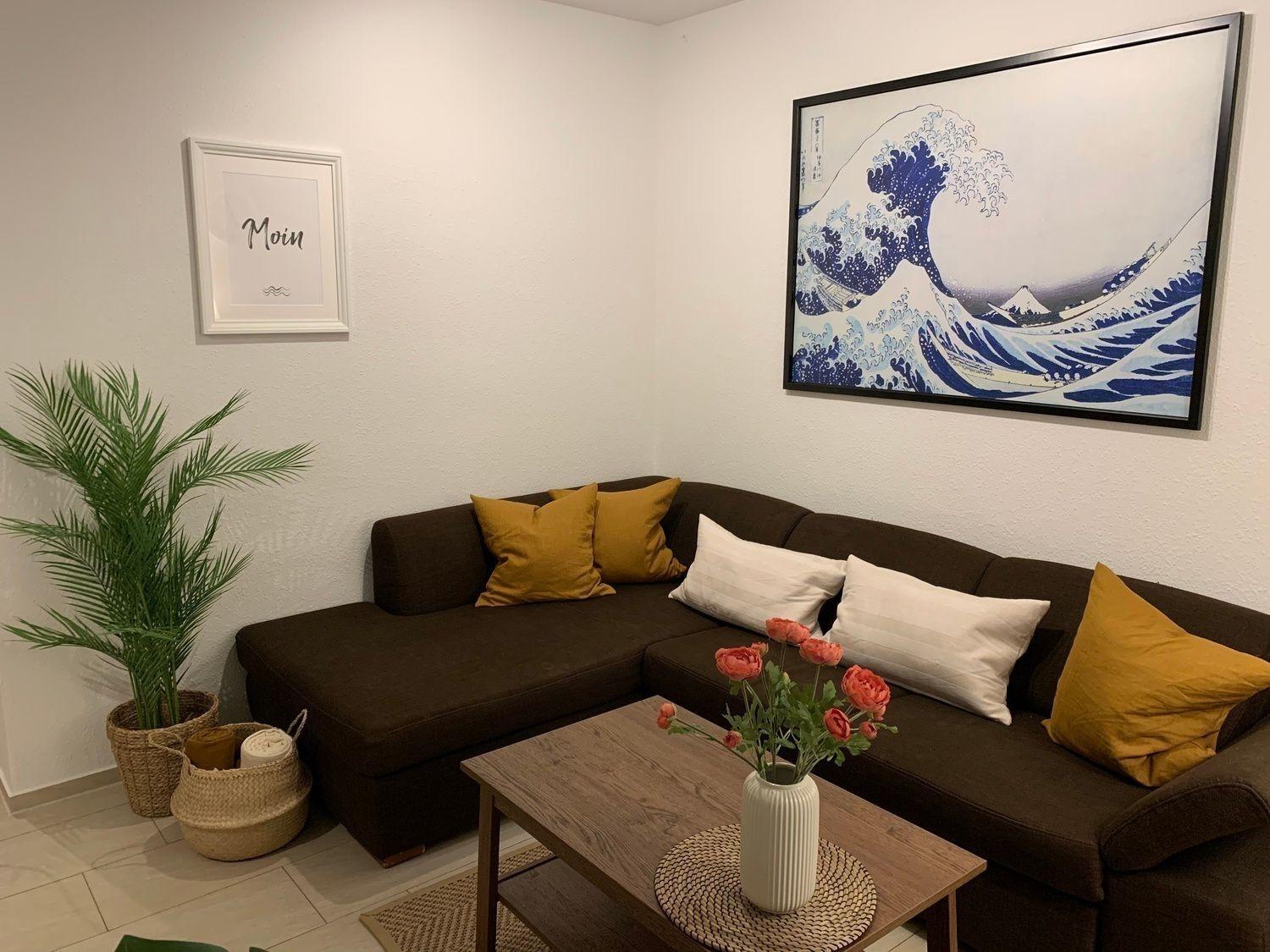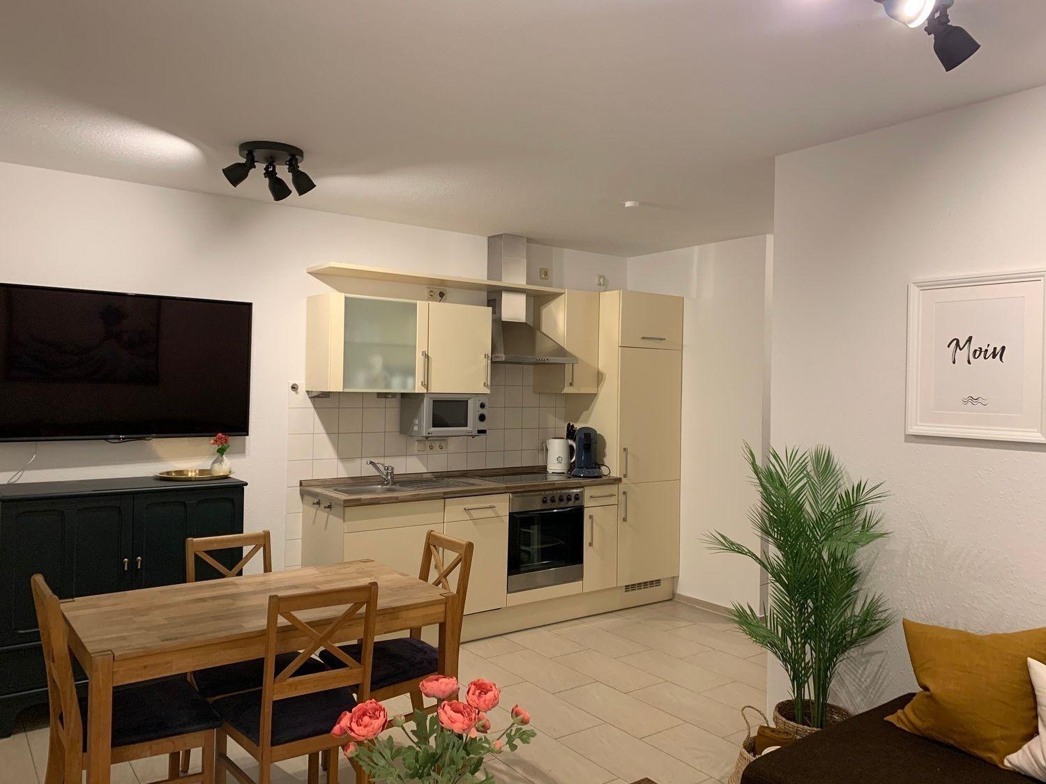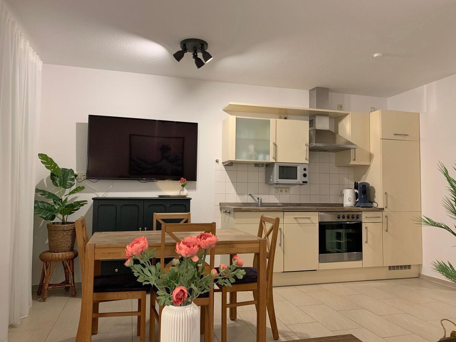 Die ca. 50 qm große EG-Wohnung hat einen modernen Wohn- und Essbereich. Erholung finden Sie auf der braunen Wohncouch. Von dort oder auch von der Essgruppe aus können Sie bequem den Flachbildschirm-TV nutzen. Die Wohnung verfügt über WLAN, somit können Sie problemlos mit Ihren Liebsten in Verbindung bleiben oder auch an Ihrem Laptop arbeiten.