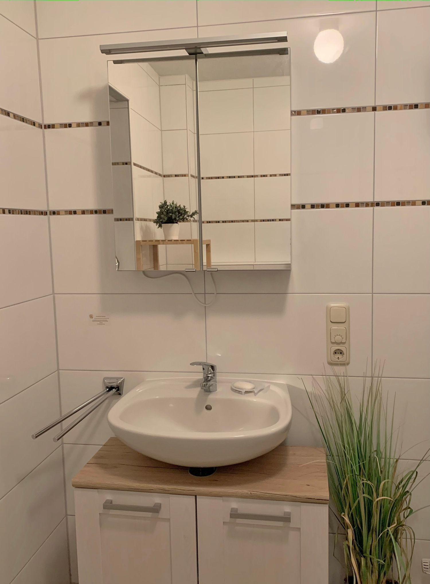 Munter werden Sie im lichtdurchfluteten Bad. Sie ist ausgestattet mit einer Dusche mit niedrigem Einstieg, ein WC und ein Waschbecken mit Unterschrank.