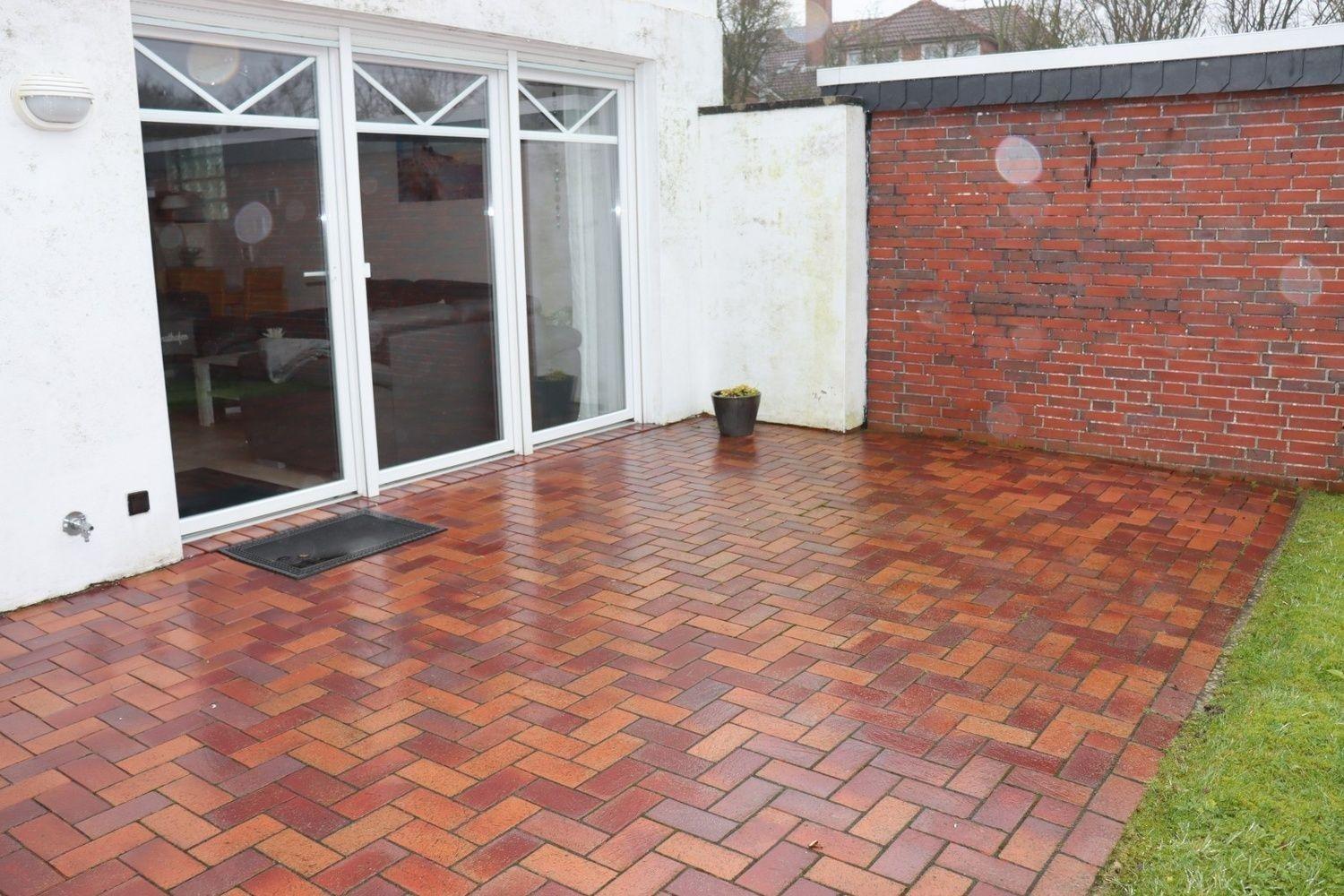 Durch die helle Wohnküche gelangen Sie auf die schöne windgeschützte Terrasse mit Gartenmöbeln, Sonnenschirm und Grill.