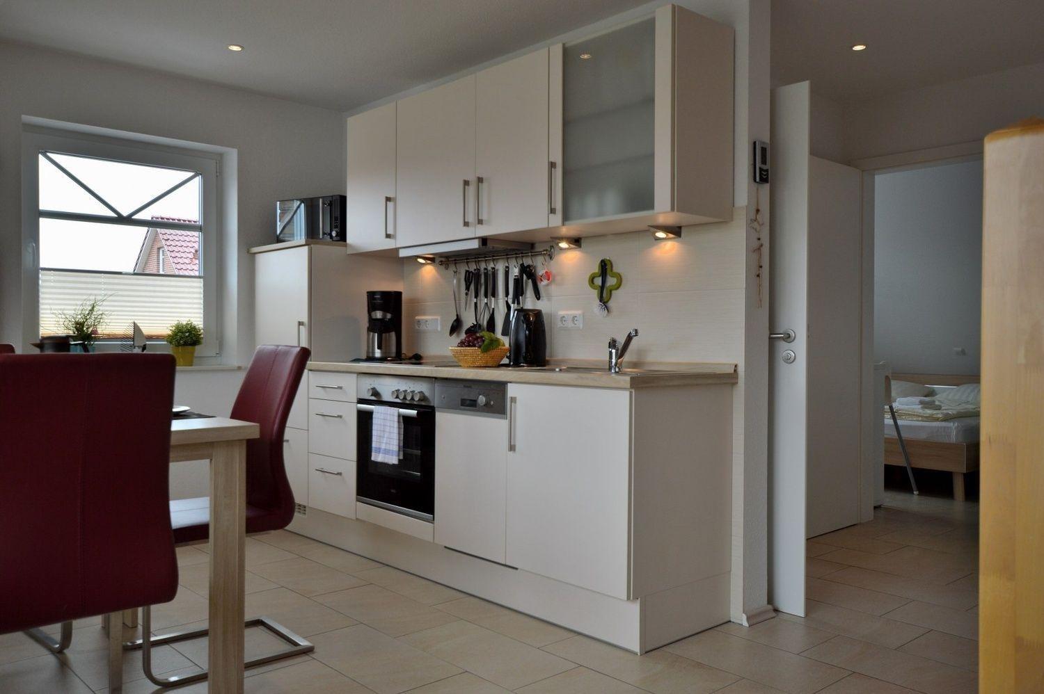 In der Komfort-Einbauküche mit gehobener Ausstattung wird es Ihnen an nichts fehlen. So stehen Ihnen zum Beispiel ein Geschirrspüler, Glaskeramik-Kochfeld, Einbauherd, Kühlschrank mit 4 Gefrierfach, Mikrowelle, Kaffeemaschine, Wasserkocher, Eierkocher, Toaster, Stabmixer... zur Verfügung.