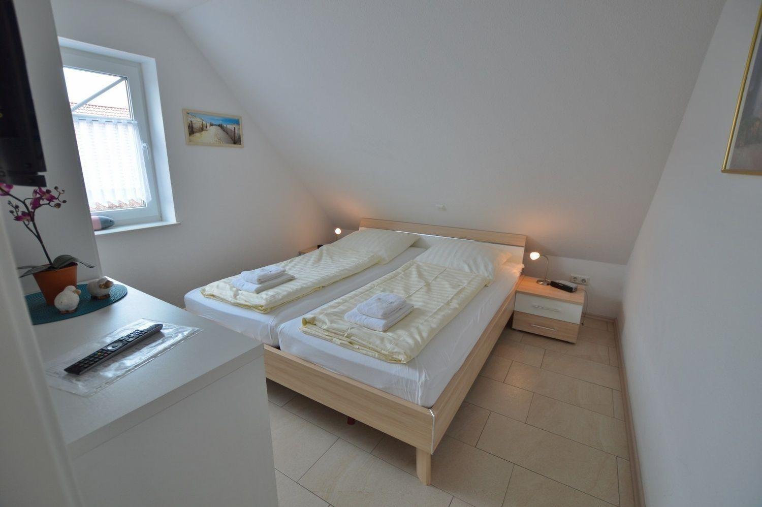 Im Elternschlafzimmer gibt es ein Doppelbett(1,80x2,00m) mit offenem Fußteil, Daunenkissen, Allergikermatratzen und verstellbaren Lattenrost sowie Nachtschränkchen, Kleiderschrank, Kommode, Radiowecker und ein LCD-TV.