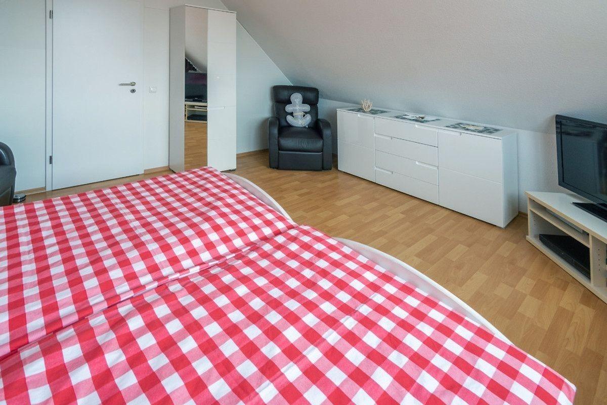 Zu einem erholten Schlaf ( Verdunkelung durch elektrische Rollläden außer im 2.Schlafzimmer da wird durch Gardinen verdunkelt), lädt das Elternschlafzimmer mit Doppelbett 1,80x2,00 m mit offenen Fußteil, geräumigen Kleiderschrank, 2 Nachtkonsolen mit Leselampe zum entspannen ein.