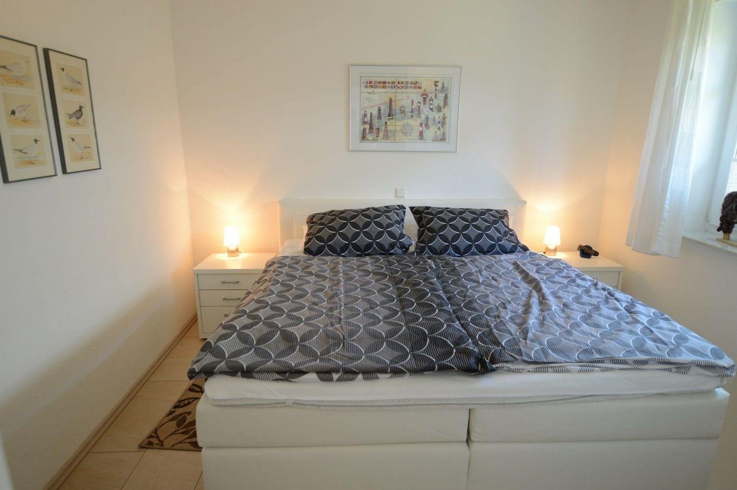 Im schönen Schlafzimmer mit konfortablem Boxspringbett(180x200) ist das Schlafen ein Genuss. Auch hier ist ein TV-Gerät vorhanden. Doppelte Kissen, ein Kleiderschrank und ein Wecker machen das Zimmer komplett.