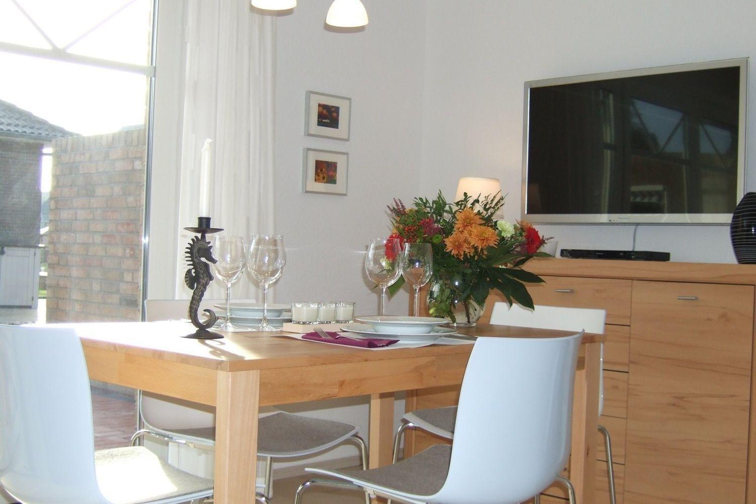 Die 50 m² große Wohnung ist modern und maritim gestaltet. Im behaglich kombinierten Wohn- und Küchenbereich finden Sie einen gemütlichen Sitzbereich mit Schlafcouch (148 cm x 198 cm) vor, auf dem Sie nach einem erfrischenden Strandspaziergang den Tag ausklingen lassen können und über den vorhandenen Flachbildschirm-TV (42 Zoll) sich über die Meldungen des Tages informieren. Ein DVD-Player und ein Radio/CD mit USB-Anschluss sorgen für Abwechslung.
