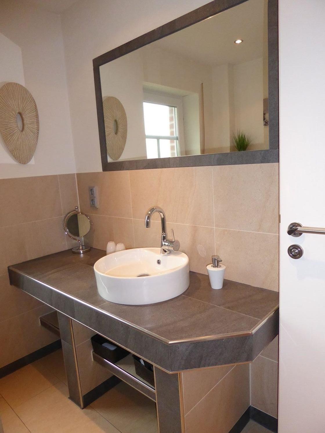 Das Badezimmer besticht durch seine hochwertige Ausstattung. Der erste Blick fällt hier auf den gefliesten Waschtisch mit Designerwaschbecken und ausreichend Stauraum. Eine bodentiefe, stufenlos begehbare Dusche und eine Fußbodenheizung runden den Gesamteindruck der Wellnessoase ab.
