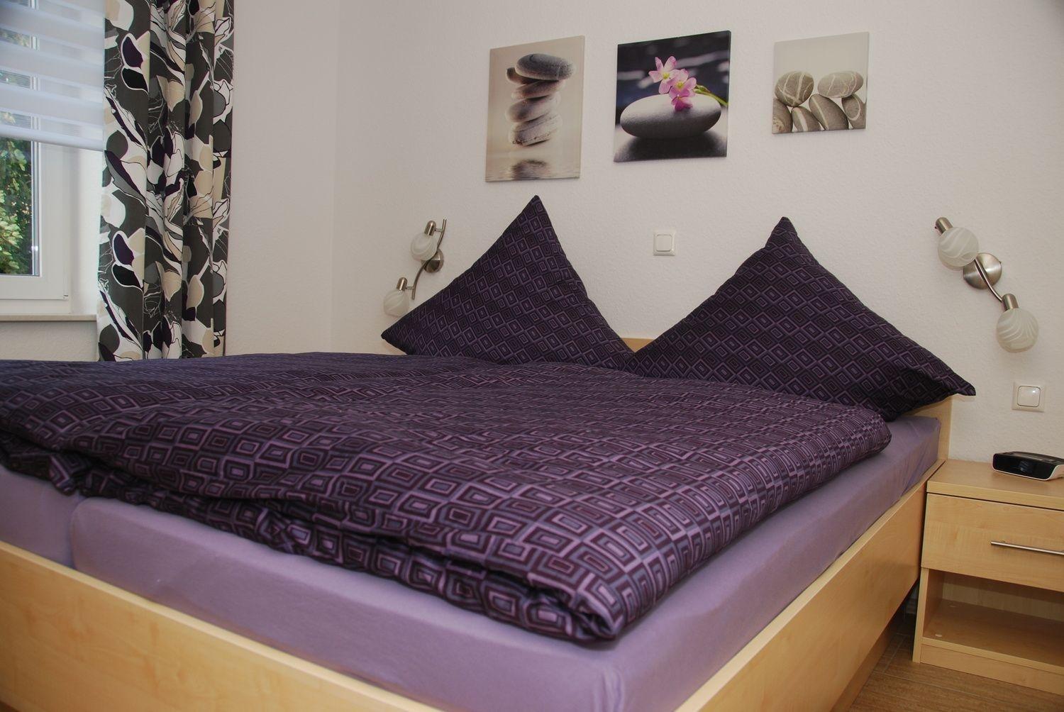 Im Elternschlafzimmer befinden sich neben einem Doppelbett mit neuen Federkernmatratzen (1,80x2,00m), zwei Nachtkonsolen und ein großzügiger Kleiderschrank, sowie ein Flachbildschirm-TV. Alle Betten haben ein offenes Fußteil und sind somit für großgewachsene Gäste geeignet.