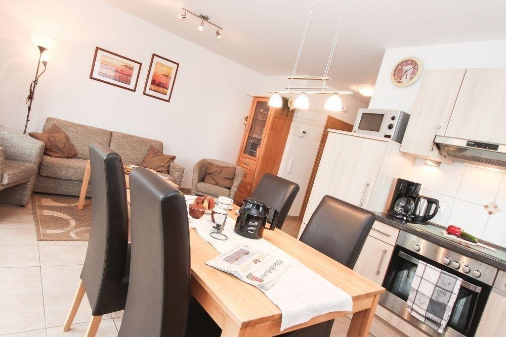 An den Küchenbereich mit vollausgestatteter Einbauküche (Mikrowelle, Geschirrspüler, Kühlschrank mit Eisfach, Toaster, Kaffeemaschine, Wasserkocher...) schließt sich mit einem Tisch und vier Stühlen der Essbereich an. Im Wohnzimmer können Sie es sich auf der hochwertigen Schlafcouch( Liegefläche 2,12 x1,50 m) oder auf den Sesseln gemütlich machen und auf dem großen Flachbildschirm-TV einen schönen Spielfilm ansehen.